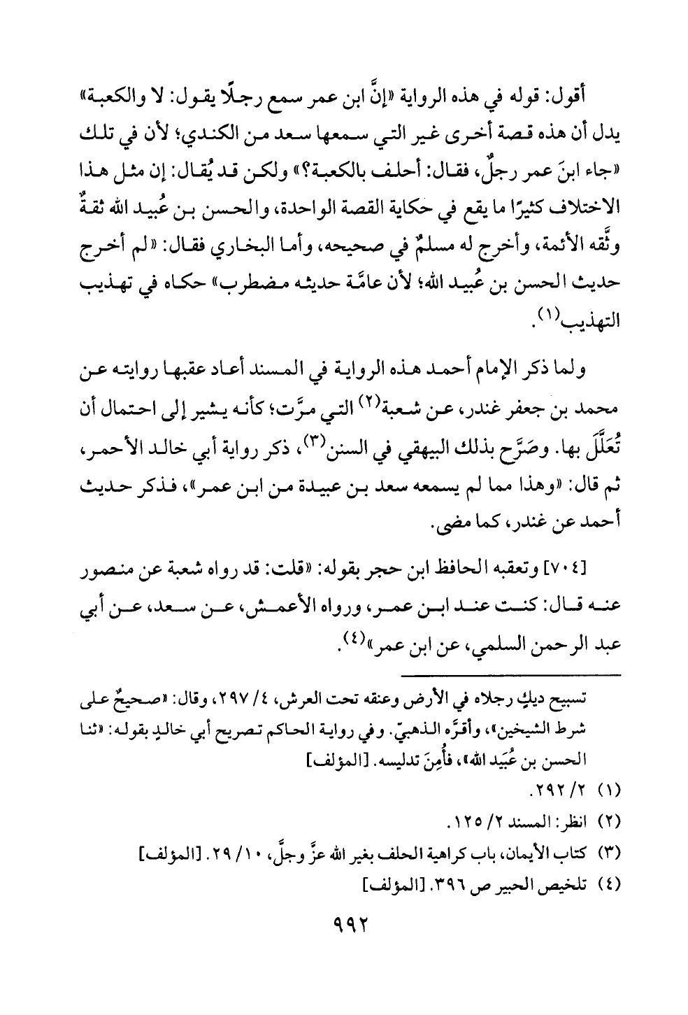أقول: قوله في هذه الرواية «إنَّ ابن عمر سمع رجلًا يقول: لا والكعبة» يدل أن هذه قصة أخرى غير التي سمعها سعد من الكندي؛ لأن في تلك «جاء ابنَ عمر رجلٌ، فقال: أحلف بالكعبة؟ » ولكن قد يُقال: إن مثل هذا الاختلاف كثيرًا ما يقع في حكاية القصة الواحدة، والحسن بن عُبيد الله ثقةٌ وثَّقه الأئمة، وأخرج له مسلمٌ في صحيحه، وأما البخاري فقال: «لم أخرج حديث الحسن بن عُبيد الله؛ لأن عامَّة حديثه مضطرب» حكاه في تهذيب التهذيب (¬١).