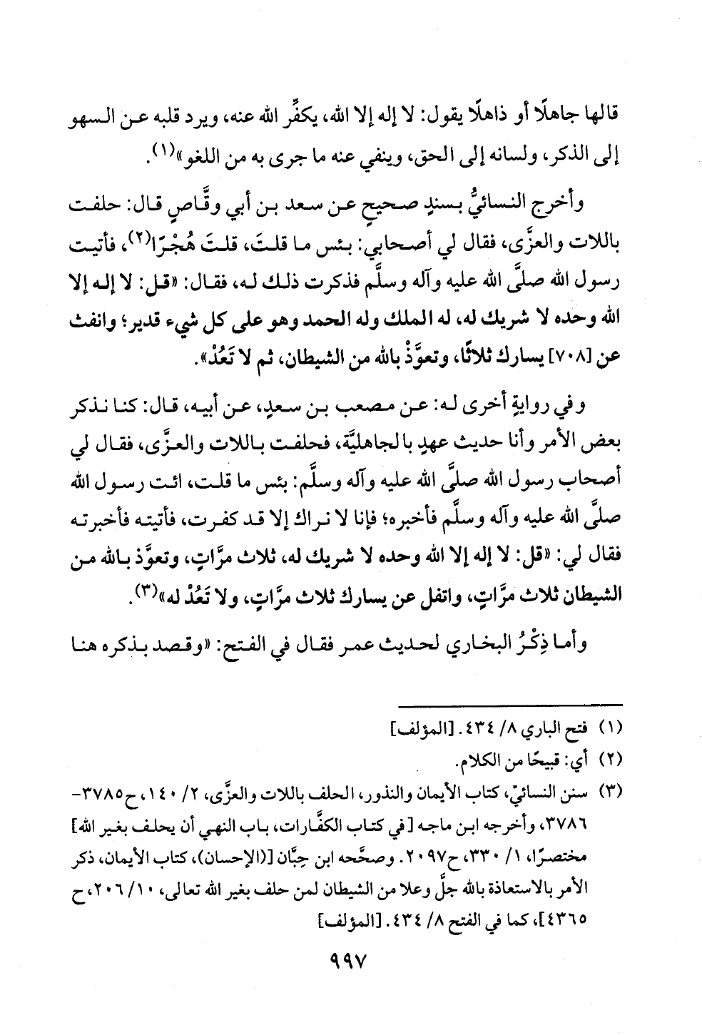 وأخرج النسائيُّ بسندٍ صحيحٍ عن سعد بن أبي وقَّاصٍ قال: حلفت باللات والعزَّى، فقال لي أصحابي: بئس ما قلتَ، قلتَ هُجْرًا (¬٢)، فأتيت رسول الله صلَّى الله عليه وآله وسلَّم فذكرت ذلك له، فقال: «قل: لا إله إلا الله وحده لا شريك له, له الملك وله الحمد وهو على كل شيء قدير؛ وانفث عن [٧٠٨] يسارك ثلاثًا، وتعوَّذْ بالله من الشيطان، ثم لا تَعُدْ».