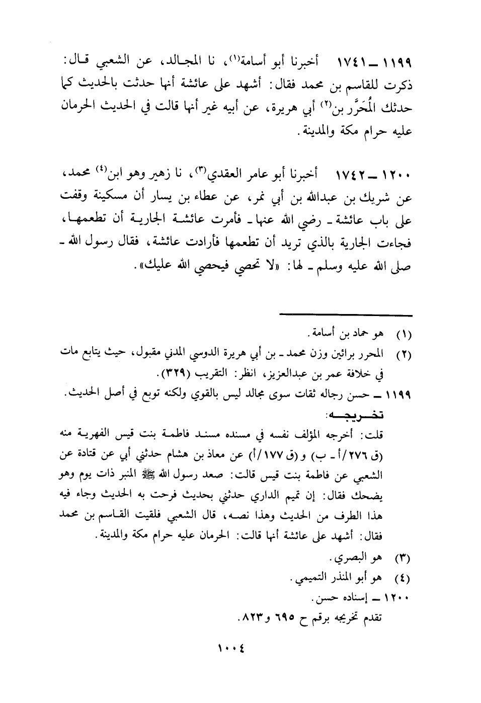 1741 - أَخْبَرَنَا أَبُو أُسَامَةَ، نا الْمُجَالِدُ، عَنِ الشَّعْبِيِّ قَالَ: ذَكَرْتُ لِلْقَاسِمِ بْنِ مُحَمَّدٍ فَقَالَ: أَشْهَدُ عَلَى عَائِشَةَ أَنَّهَا حَدَّثَتْ بِالْحَدِيثِ، كَمَا حَدَّثَكَ الْمُحَرَّرُ بْنُ أَبِي هُرَيْرَةَ، عَنْ أَبِيهِ، غَيْرَ أَنَّهَا قَالَتْ فِي الْحَدِيثِ: §الْحَرَمَانِ عَلَيْهِ حَرَامٌ، مَكَّةُ وَالْمَدِينَةُ