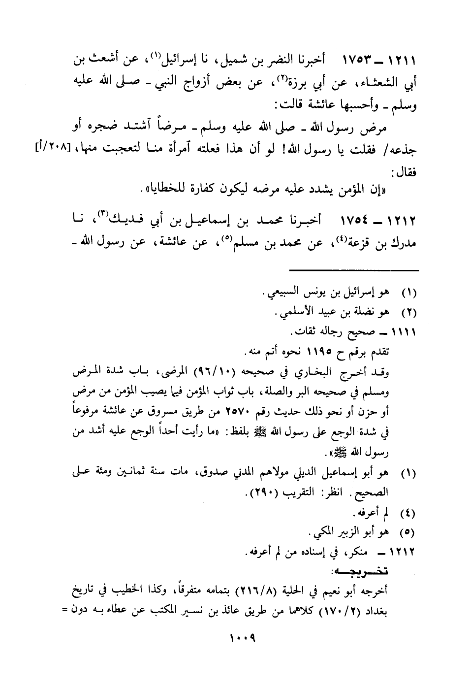 1753 - أَخْبَرَنَا النَّضْرُ بْنُ شُمَيْلٍ، نا إِسْرَائِيلُ، عَنْ أَشْعَثَ بْنِ أَبِي الشَّعْثَاءِ، عَنْ أَبِي بَرْزَةَ، عَنْ بَعْضِ، أَزْوَاجِ النَّبِيِّ صَلَّى اللهُ عَلَيْهِ وَسَلَّمَ وَأَحْسَبُهَا عَائِشَةَ قَالَتْ: مَرِضَ رَسُولُ اللَّهِ صَلَّى اللهُ عَلَيْهِ وَسَلَّمَ مَرَضًا اشْتَدَّ ضَجَرُهُ أَوْ جَذَعُهُ، فَقُلْتُ يَا رَسُولَ اللَّهِ، لَوْ أَنَّ هَذَا فَعَلَتْهُ امْرَأَةٌ مِنَّا لَتَعَجَّبْتُ مِنْهَا. فَقَالَ: إِنَّ §الْمُؤْمِنَ يُشَدَّدُ عَلَيْهِ مَرَضُهُ لِيَكُونَ كَفَّارَةً لِلْخَطَايَا "