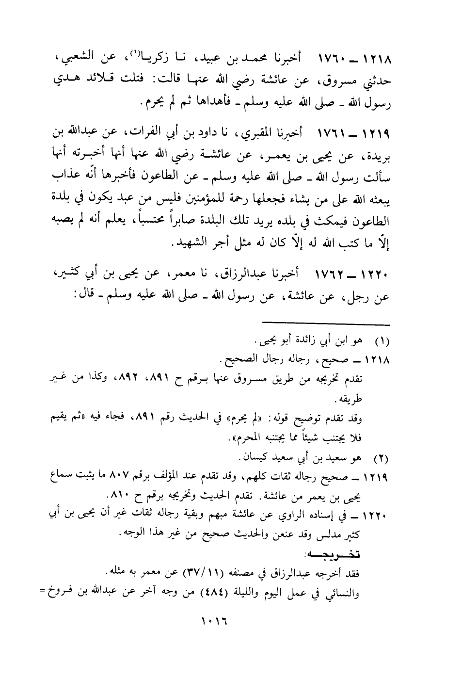 1761 - أَخْبَرَنَا الْمَقْبُرِيُّ، نا دَاوُدُ بْنُ أَبِي الْفُرَاتِ، عَنْ عَبْدِ اللَّهِ بْنِ بُرَيْدَةَ، عَنْ يَحْيَى بْنِ يَعْمَرَ، عَنْ عَائِشَةَ رَضِيَ اللَّهُ عَنْهَا أَنَّهَا أَخْبَرَتْهُ أَنَّهَا سَأَلَتْ رَسُولَ اللَّهِ صَلَّى اللهُ عَلَيْهِ وَسَلَّمَ عَنِ الطَّاعُونِ فَأَخْبَرَهَا أَنَّهُ عَذَابٌ يَبْعَثُهُ اللَّهُ عَلَى مَنْ يَشَاءُ فَجَعَلَهَا رَحْمَةً لِلْمُؤْمِنِينَ §فَلَيْسَ مِنْ عَبْدٍ يَكُونُ فِي بَلْدَةِ الطَّاعُونِ فَيَمْكُثُ فِي بَلْدِهِ يُرِيدُ تِلْكَ الْبَلْدَةَ صَابِرًا مُحْتَسِبًا يَعْلَمُ أَنَّهُ لَمْ يُصِبْهُ إِلَّا مَا كَتَبَ اللَّهُ لَهُ إِلَّا كَانَ لَهُ مِثْلُ أَجْرِ الشَّهِيدِ "