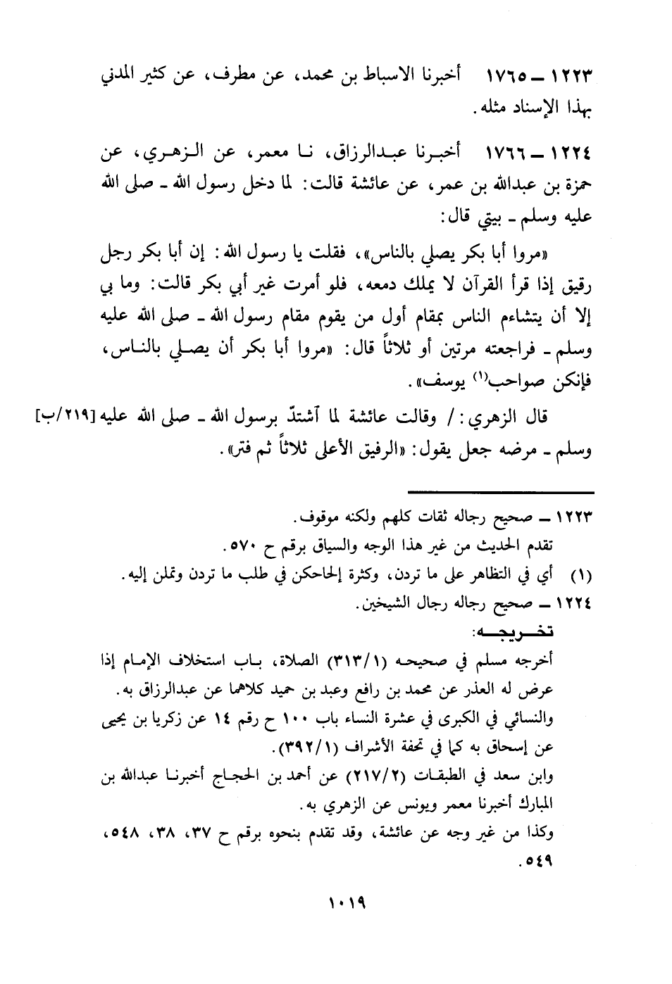 1766 - أَخْبَرَنَا عَبْدُ الرَّزَّاقِ، نا مَعْمَرٌ، عَنِ الزُّهْرِيِّ، عَنْ حَمْزَةَ بْنِ عَبْدِ اللَّهِ بْنِ عُمَرَ، عَنْ عَائِشَةَ قَالَتْ: لَمَّا دَخَلَ رَسُولُ اللَّهِ صَلَّى اللهُ عَلَيْهِ وَسَلَّمَ بَيْتِي قَالَ: §مُرُوا أَبَا بَكْرٍ يُصَلِّي بِالنَّاسِ. فَقُلْتُ: يَا رَسُولَ اللَّهِ، أَنَّ أَبَا بَكْرٍ رَجُلٌ رَقِيقٌ إِذَا قَرَأَ الْقُرْآنَ لَا يَمْلِكُ دَمْعَةً، فَلَوْ أَمَرْتَ غَيْرَ أَبِي بَكْرٍ قَالَتْ: وَمَا بِي إِلَّا أَنْ يَتَشَاءَمَ النَّاسُ بِمَقَامِ أَوَّلِ مَنْ يَقُومُ مَقَامَ رَسُولِ اللَّهِ صَلَّى اللهُ عَلَيْهِ وَسَلَّمَ فَرَاجَعْتُهُ مَرَّتَيْنِ أَوْ ثَلَاثًا. قَالَ: مُرُوا أَبَا بَكْرٍ أَنْ يُصَلِّي بِالنَّاسِ فَإِنَّكُنَّ صَوَاحِبُ يُوسُفَ قَالَ الزُّهْرِيُّ: وَقَالَتْ عَائِشَةُ لَمَّا اشْتَدَّ بِرَسُولِ اللَّهِ صَلَّى اللهُ عَلَيْهِ وَسَلَّمَ مَرَضُهُ جَعَلَ يَقُولُ: الرَّفِيقَ الْأَعَلَى ثَلَاثًا ثُمَّ فَتَرَ