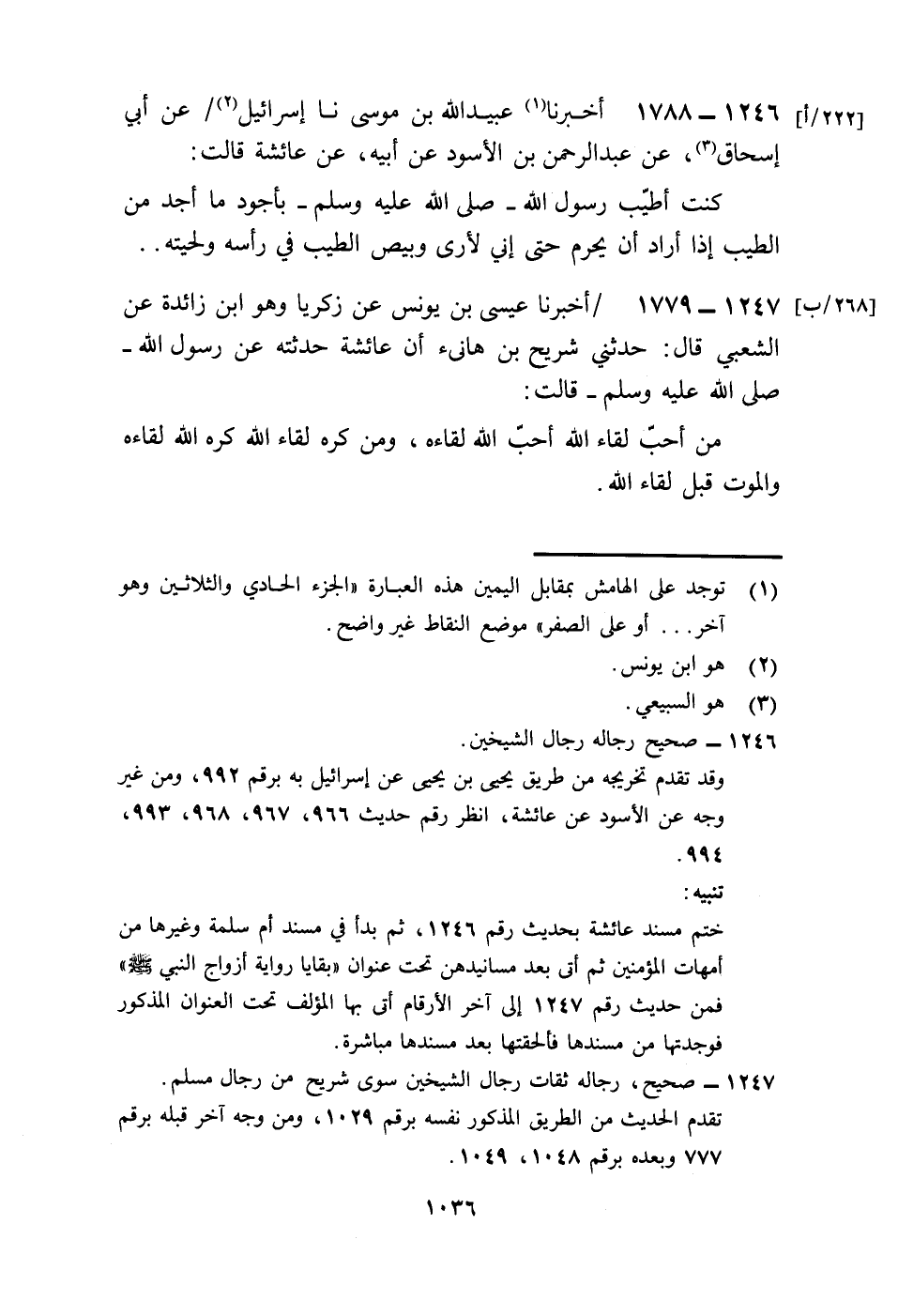 أَخْبَرَنَا عِيسَى بْنُ يُونُسَ، عَنْ زَكَرِيَّا وَهُوَ ابْنُ زَائِدَةَ، عَنِ الشَّعْبِيِّ قَالَ: حَدَّثَنِي شُرَيْحُ بْنُ هَانِئٍ، أَنَّ عَائِشَةَ حَدَّثَتْهُ، عَنْ رَسُولِ اللَّهِ صَلَّى اللهُ عَلَيْهِ وَسَلَّمَ قَالَتْ: «§مَنْ أَحَبَّ لِقَاءَ اللَّهِ أَحَبَّ اللَّهُ لِقَاءَهُ وَمَنْ كَرِهَ لِقَاءَ اللَّهِ كَرِهَ اللَّهُ لِقَاءَهُ، وَالْمَوْتُ قَبْلَ لِقَاءِ اللَّهِ»