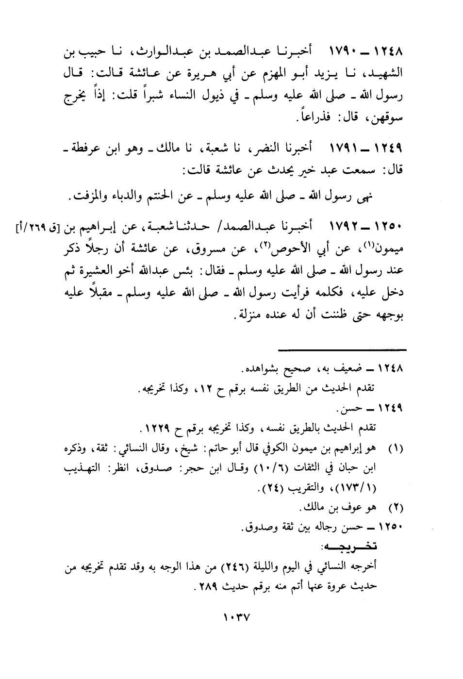 1792 - أَخْبَرَنَا عَبْدُ الصَّمَدِ، حَدَّثَنَا شُعْبَةُ، عَنْ إِبْرَاهِيمَ بْنِ مَيْمُونٍ، عَنْ أَبِي الْأَحْوَصِ، عَنْ مَسْرُوقٍ، عَنْ عَائِشَةَ، أَنَّ رَجُلًا ذُكِرَ عِنْدَ رَسُولِ اللَّهِ صَلَّى اللهُ عَلَيْهِ وَسَلَّمَ فَقَالَ: «§بِئْسَ عَبْدُ اللَّهِ أَخُو الْعَشِيرَةِ» ثُمَّ دَخَلَ عَلَيْهِ فَكَلَّمَهُ فَرَأَيْتُ رَسُولَ اللَّهِ صَلَّى اللهُ عَلَيْهِ وَسَلَّمَ مُقْبِلًا عَلَيْهِ بِوَجْهِهِ حَتَّى ظَنَنْتُ أَنَّ لَهُ عِنْدَهُ مَنْزِلَةً