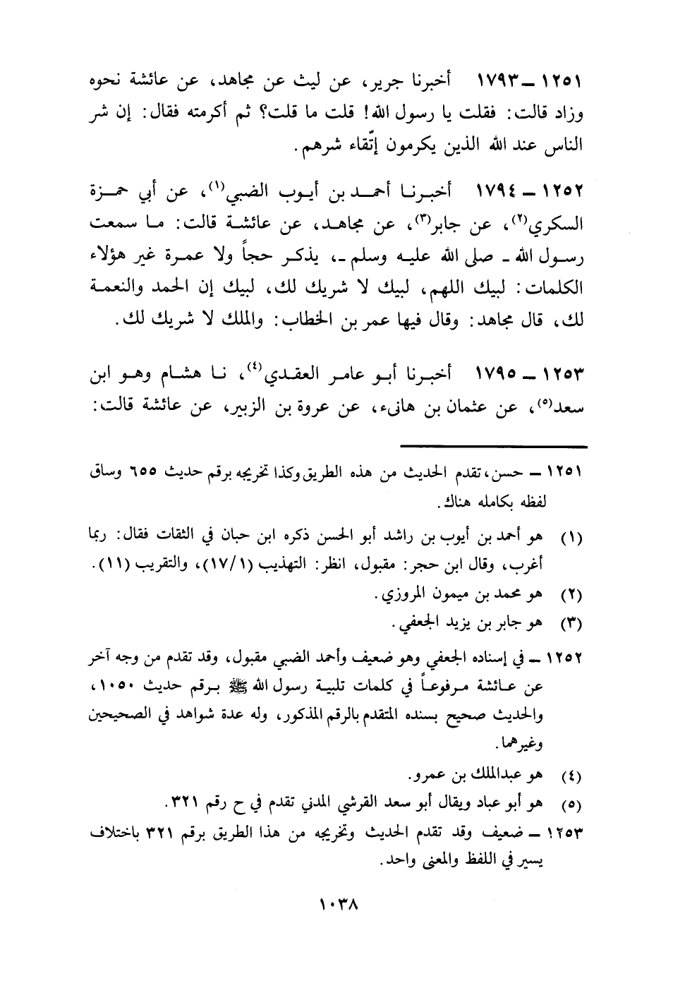1794 - أَخْبَرَنَا أَحْمَدُ بْنُ أَيُّوبَ الضَّبِّيُّ، عَنْ أَبِي حَمْزَةَ السُّكَّرِيِّ، عَنْ جَابِرٍ، عَنْ مُجَاهِدٍ، عَنْ عَائِشَةَ قَالَتْ: مَا سَمِعْتُ رَسُولَ اللَّهِ صَلَّى اللهُ عَلَيْهِ وَسَلَّمَ يَذْكُرُ حَجًّا وَلَا عُمْرَةً غَيْرَ هَؤُلَاءِ الْكَلِمَاتِ: «§لَبَّيْكَ اللَّهُمَّ لَبَّيْكَ، لَا شَرِيكَ لَكَ لَبَّيْكَ، إِنَّ الْحَمْدَ وَالنِّعْمَةَ لَكَ» . قَالَ مُجَاهِدٌ وَقَالَ فِيهَا عُمَرُ بْنُ الْخَطَّابِ: وَالْمُلْكَ لَا شَرِيكَ لَكَ