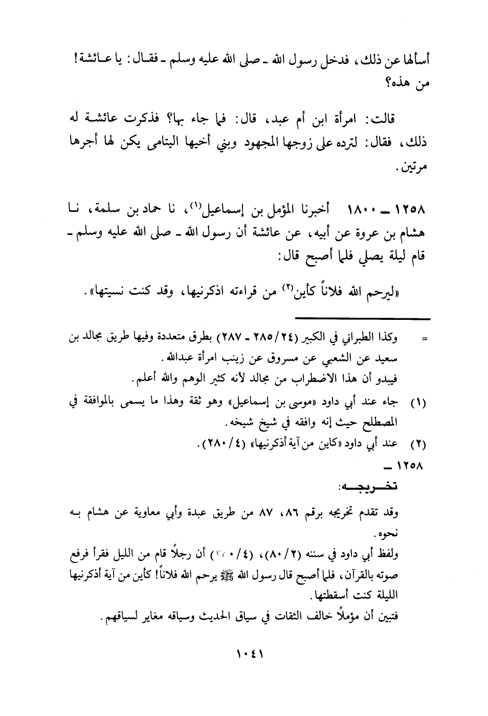 1800 - أَخْبَرَنَا الْمُؤَمَّلُ بْنُ إِسْمَاعِيلَ، نا حَمَّادُ بْنُ سَلَمَةَ، نا هِشَامُ بْنُ عُرْوَةَ، عَنْ أَبِيهِ، عَنْ عَائِشَةَ، أَنَّ رَسُولَ اللَّهِ صَلَّى اللهُ عَلَيْهِ وَسَلَّمَ قَامَ لَيْلَةً يُصَلِّي فَلَمَّا أَصْبَحَ قَالَ: «§لِيَرْحِمِ اللَّهُ فُلَانًا، كَأَيِّنْ مِنْ قِرَاءَتِهِ أَذْكَرَنِيهَا وَقَدْ كُنْتُ نُسِّيتُهَا»