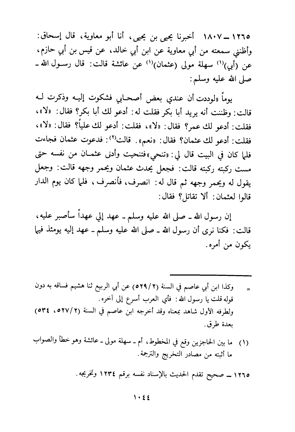 1807 - أَخْبَرَنَا يَحْيَى بْنُ يَحْيَى، أنا أَبُو مُعَاوِيَةَ قَالَ إِسْحَاقُ: وَأَظُنُّنِي سَمِعْتُهُ مِنْ أَبِي مُعَاوِيَةَ، عَنِ ابْنِ أَبِي خَالِدٍ، عَنْ قَيْسِ بْنِ أَبِي حَازِمٍ، عَنْ أَبِي سَهْلَةَ، مَوْلَى عُثْمَانَ، عَنْ عَائِشَةَ قَالَتْ: قَالَ رَسُولُ اللَّهِ صَلَّى اللهُ عَلَيْهِ وَسَلَّمَ يَوْمًا: «§لَوَدِدْتُ أَنَّ عِنْدِي بَعْضَ أَصْحَابِي فَشَكَوْتُ إِلَيْهِ وَذَكَرْتُ لَهُ» قَالَتْ: فَظَنَنْتُ أَنَّهُ يُرِيدُ أَبَا بَكْرٍ، فَقُلْتُ لَهُ: أَدْعُو لَكَ أَبَا بَكْرٍ؟ فَقَالَ: «لَا» . فَقُلْتُ: أَدْعُو لَكَ عُمَرَ؟ فَقَالَ: «لَا» . فَقُلْتُ: أَدْعُو لَكَ عَلِيًّا؟ فَقَالَ: «لَا» . فَقُلْتُ: أَدْعُو لَكَ عُثْمَانَ؟ فَقَالَ: «نَعَمْ» . قَالَتْ: فَدَعَوْتُ عُثْمَانَ فَجَاءَ فَلَمَّا كَانَ فِي الْبَيْتِ قَالَ لِي: «تَنَحِّي» ، فَتَنَحَّيْتُ، وَأَدْنَى عُثْمَانَ مِنْ نَفْسِهِ حَتَّى مَسَّتْ رُكْبَتُهُ رُكْبَتَهُ قَالَتْ: فَجَعَلَ يُحَدِّثُ عُثْمَانَ وَيَحْمَرُّ وَجْهُهُ قَالَتْ: وَجَعَلَ يَقُولُ لَهُ وَيَحْمَرُّ وَجْهُهُ، ثُمَّ قَالَ لَهُ: «انْصَرِفْ» ، فَانْصَرَفَ. فَلَمَّا كَانَ يَوْمُ الدَّارِ، قَالُوا لِعُثْمَانَ: أَلَا تُقَاتِلُ؟ فَقَالَ: إِنَّ رَسُولَ اللَّهِ صَلَّى اللهُ عَلَيْهِ وَسَلَّمَ عَهِدَ إِلَيَّ عَهْدًا سَأَصْبِرُ عَلَيْهِ. قَالَتْ: فَكُنَّا نَرَى أَنَّ رَسُولَ اللَّهِ صَلَّى اللهُ عَلَيْهِ وَسَلَّمَ عَهِدَ إِلَيْهِ يَوْمَئِذٍ فِيمَا يَكُونُ مِنْ أَمْرِهِ