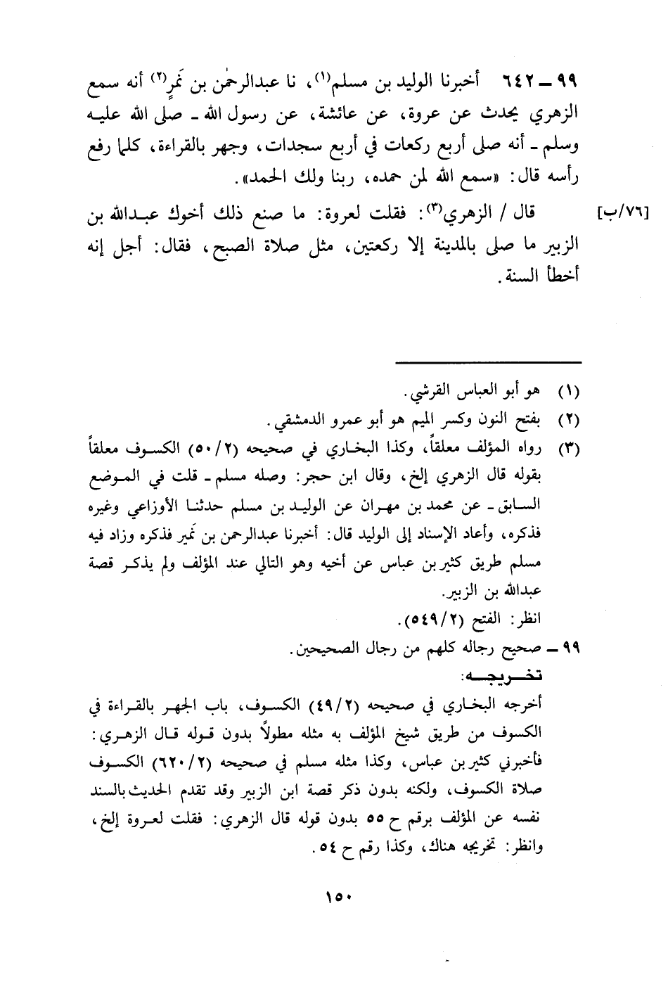 642 - أَخْبَرَنَا الْوَلِيدُ بْنُ مُسْلِمٍ، نا عَبْدُ الرَّحْمَنِ بْنُ نَمِرٍ أَنَّهُ سَمِعَ الزُّهْرِيَّ يُحَدِّثُ عَنْ عُرْوَةَ، عَنْ عَائِشَةَ، عَنْ رَسُولِ اللَّهِ صَلَّى اللهُ عَلَيْهِ وَسَلَّمَ أَنَّهُ §صَلَّى أَرْبَعَ رَكَعَاتٍ فِي أَرْبَعِ سَجَدَاتٍ، وَجَهَرَ بِالْقِرَاءَةِ، كُلَّمَا رَفَعَ رَأْسَهُ قَالَ: «سَمِعَ اللَّهُ لِمَنْ حَمِدَهُ، رَبَّنَا وَلَكَ الْحَمْدُ» . قَالَ الزُّهْرِيُّ: فَقُلْتُ لِعُرْوَةَ: مَا صَنَعَ ذَلِكَ أَخُوكَ عَبْدُ اللَّهِ بْنُ الزُّبَيْرِ مَا صَلَّى بِالْمَدِينَةِ إِلَّا رَكْعَتَيْنِ مِثْلَ صَلَاةِ الصُّبْحِ، فَقَالَ: أَجَلْ، إِنَّهُ أَخْطَأَ السُّنَّةَ