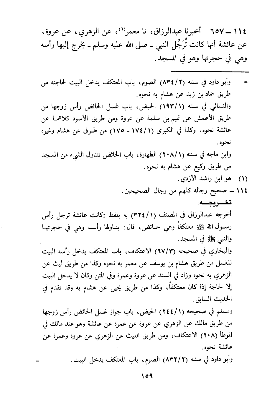 657 - أَخْبَرَنَا عَبْدُ الرَّزَّاقِ، نا مَعْمَرٌ، عَنِ الزُّهْرِيِّ، عَنْ عُرْوَةَ، عَنْ عَائِشَةَ أَنَّهَا كَانَتْ §تُرَجِّلُ النَّبِيَّ صَلَّى اللهُ عَلَيْهِ وَسَلَّمَ يُخْرِجُ إِلَيْهَا رَأْسَهُ وَهِيَ فِي حُجْرَتِهَا وَهُوَ فِي الْمَسْجِدِ.