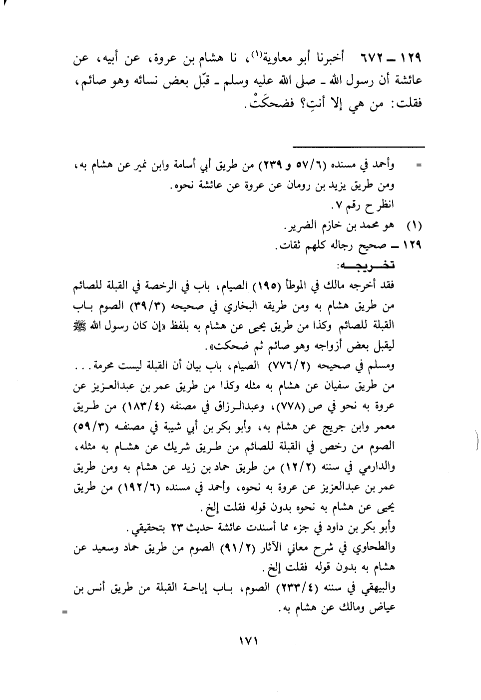 672 - أَخْبَرَنَا أَبُو مُعَاوِيَةَ، نا هِشَامُ بْنُ عُرْوَةَ، عَنْ أَبِيهِ، عَنْ عَائِشَةَ، أَنَّ رَسُولَ اللَّهِ صَلَّى اللهُ عَلَيْهِ وَسَلَّمَ §قَبَّلَ بَعْضَ نِسَائِهِ وَهُوَ صَائِمٌ، فَقُلْتُ: مَنْ هِيَ إِلَّا أَنْتِ، فَضَحِكَتْ