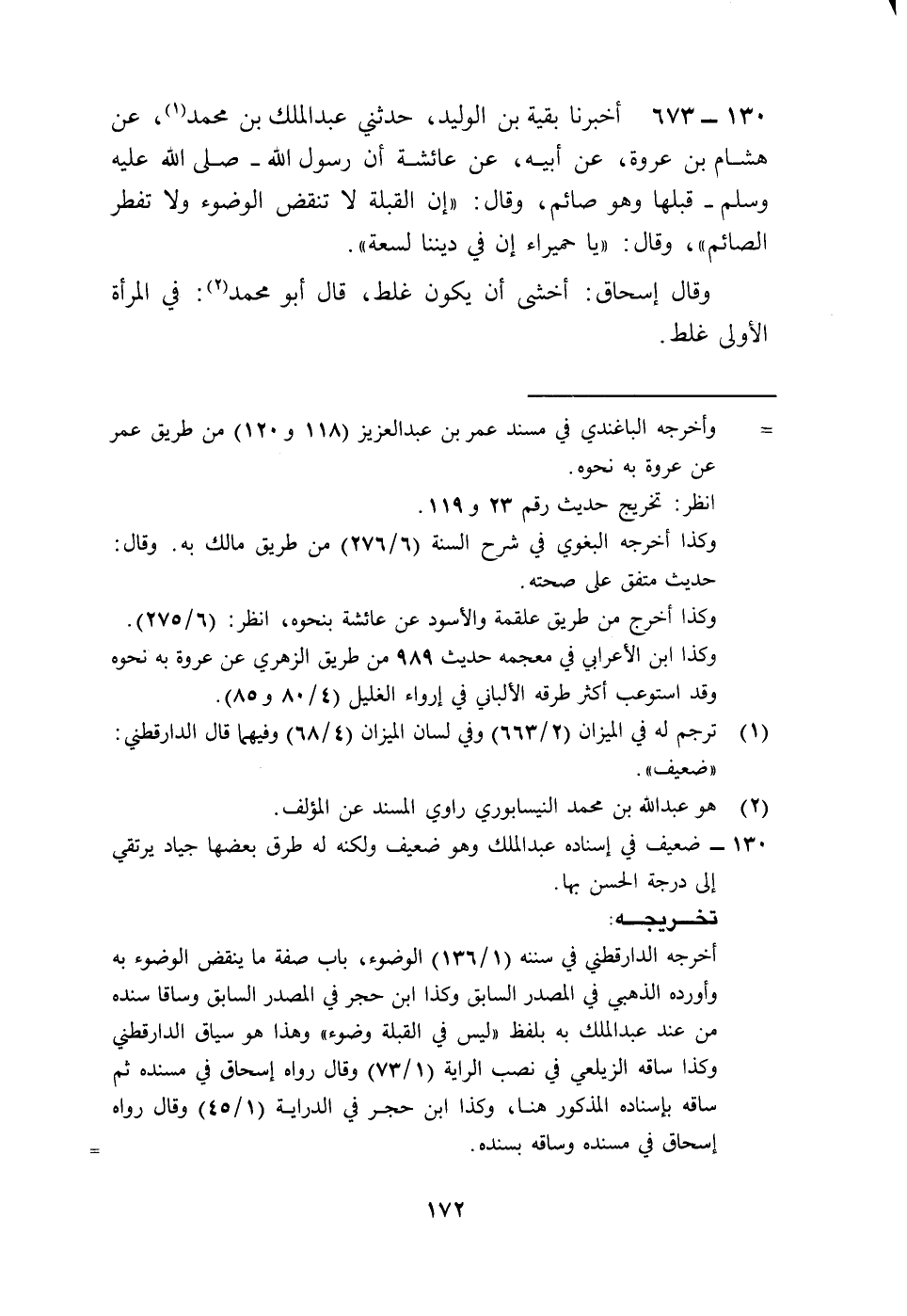 673 - أَخْبَرَنَا بَقِيَّةُ بْنُ الْوَلِيدِ، حَدَّثَنِي عَبْدُ الْمَلِكِ بْنُ مُحَمَّدٍ، عَنْ هِشَامِ بْنِ عُرْوَةَ، عَنْ أَبِيهِ، عَنْ عَائِشَةَ أَنَّ رَسُولَ اللَّهِ صَلَّى اللهُ عَلَيْهِ وَسَلَّمَ قَبَّلَهَا وَهُوَ صَائِمٌ، وَقَالَ: «إِنَّ §الْقُبْلَةَ لَا تَنْقُضُ الْوُضُوءَ، وَلَا تُفْطِرُ الصَّائِمَ» وَقَالَ: «يَا حُمَيْرَاءُ إِنَّ فِي دِينِنِا لَسَعَةً» ، وَقَالَ إِسْحَاقُ: أَخْشَى أَنْ يَكُونَ غَلِطَ، قَالَ أَبُو مُحَمَّدٍ: فِي الْمَرَّةِ الْأُولَى غَلَطٌ