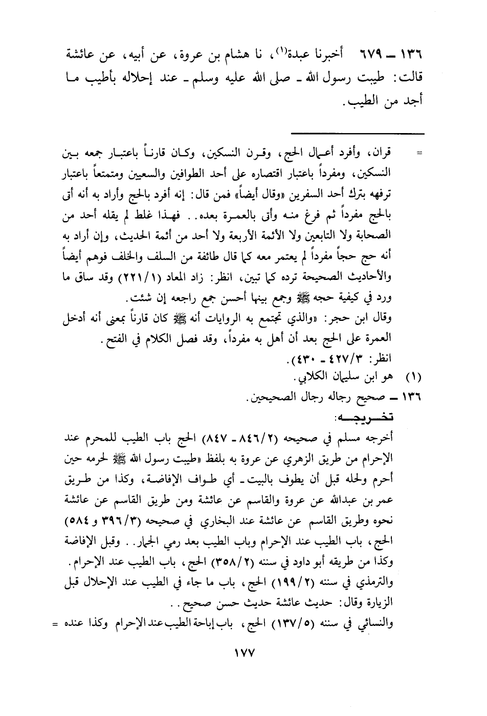 679 - أَخْبَرَنَا عَبْدَةُ، نا هِشَامُ بْنُ عُرْوَةَ، عَنْ أَبِيهِ، عَنْ عَائِشَةَ قَالَتْ: §طَيَّبْتُ رَسُولَ اللَّهِ صَلَّى اللهُ عَلَيْهِ وَسَلَّمَ عِنْدَ إِحْلَالِهِ بِأَطْيَبِ مَا أَجِدُ مِنَ الطِّيبِ