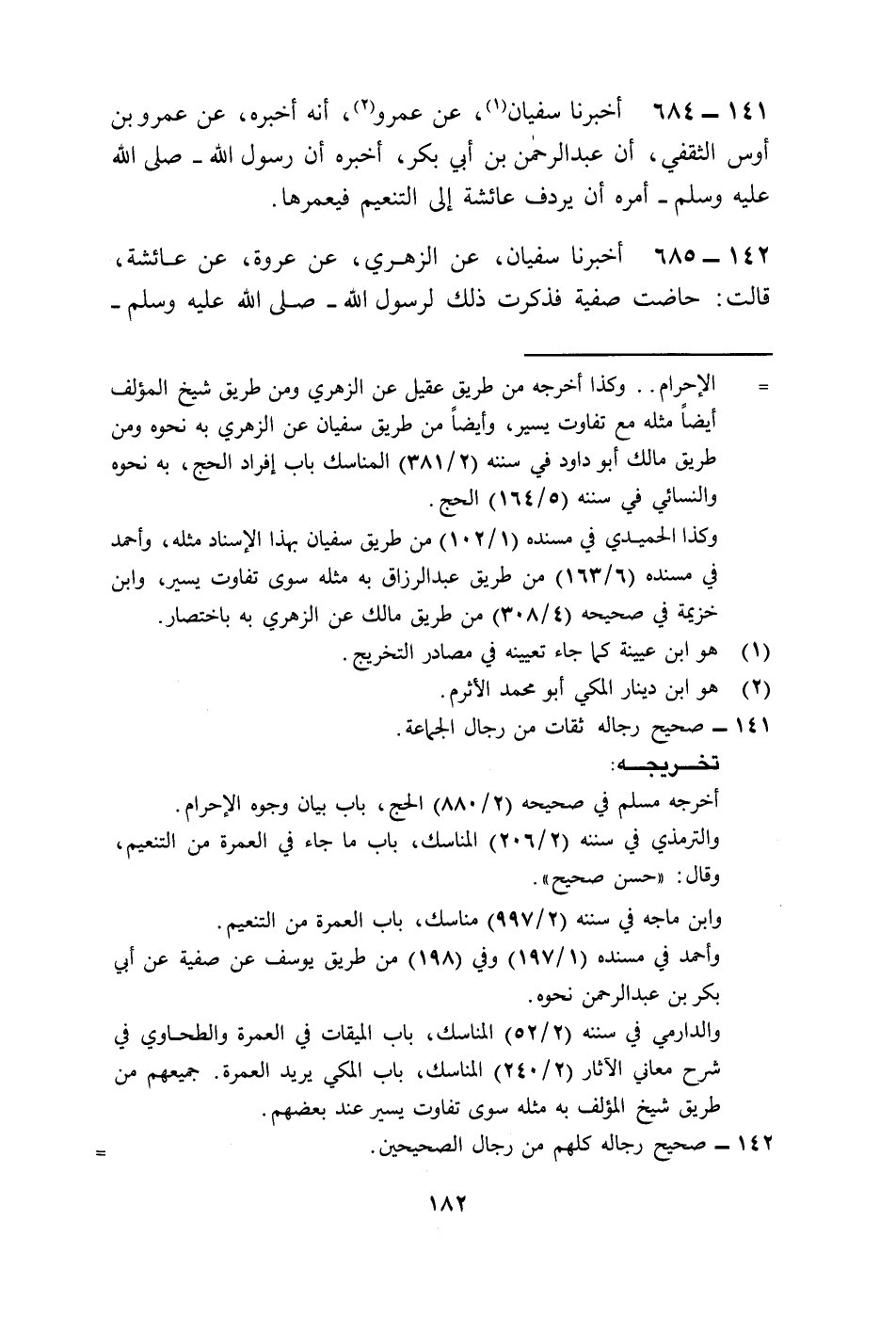 684 - أَخْبَرَنَا سُفْيَانُ، عَنْ عَمْرٍو أَنَّهُ أَخْبَرَهُ عَنْ عَمْرِو بْنِ أَوْسٍ الثَّقَفِيِّ أَنَّ عَبْدَ الرَّحْمَنِ بْنَ أَبِي بَكْرٍ أَخْبَرَهُ أَنَّ رَسُولَ اللَّهِ صَلَّى اللهُ عَلَيْهِ وَسَلَّمَ §أَمَرَهُ أَنْ يُرْدِفَ عَائِشَةَ إِلَى التَّنْعِيمِ، فَيُعْمِرَهَا