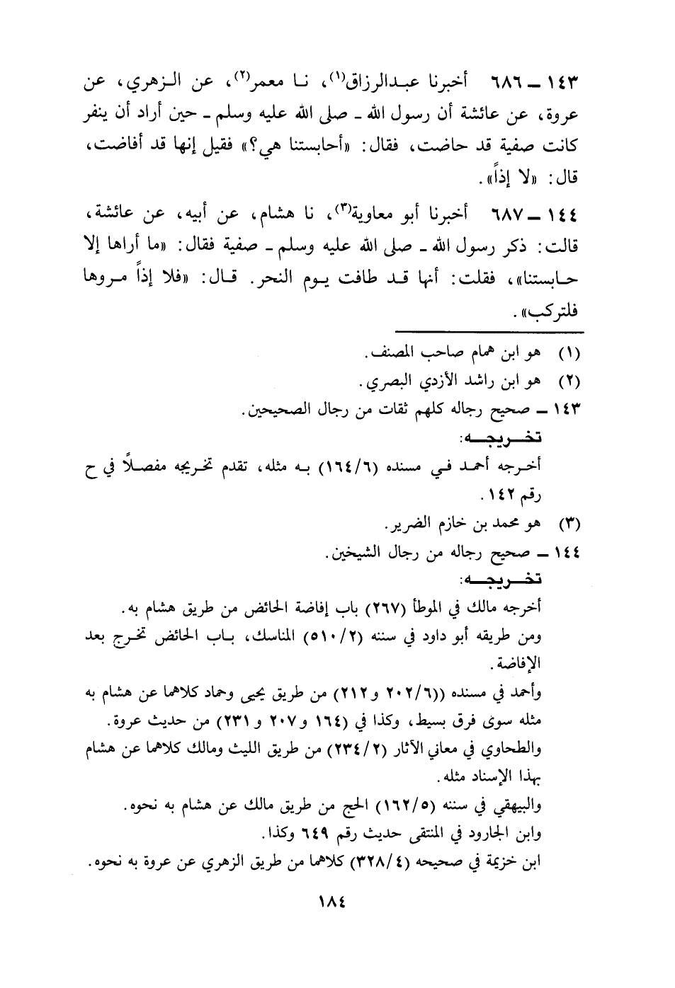 686 - أَخْبَرَنَا عَبْدُ الرَّزَّاقِ، نا مَعْمَرٌ، عَنِ الزُّهْرِيِّ، عَنْ عُرْوَةَ، عَنْ عَائِشَةَ أَنَّ رَسُولَ اللَّهِ صَلَّى اللهُ عَلَيْهِ وَسَلَّمَ حِينَ أَرَادَ أَنْ يَنْفِرَ كَانَتْ صَفِيَّةُ قَدْ حَاضَتْ، فَقَالَ: «§أَحَابِسَتُنَا هِيَ؟» فَقِيلَ: إِنَّهَا قَدْ أَفَاضَتْ، قَالَ: «لَا إِذًا»