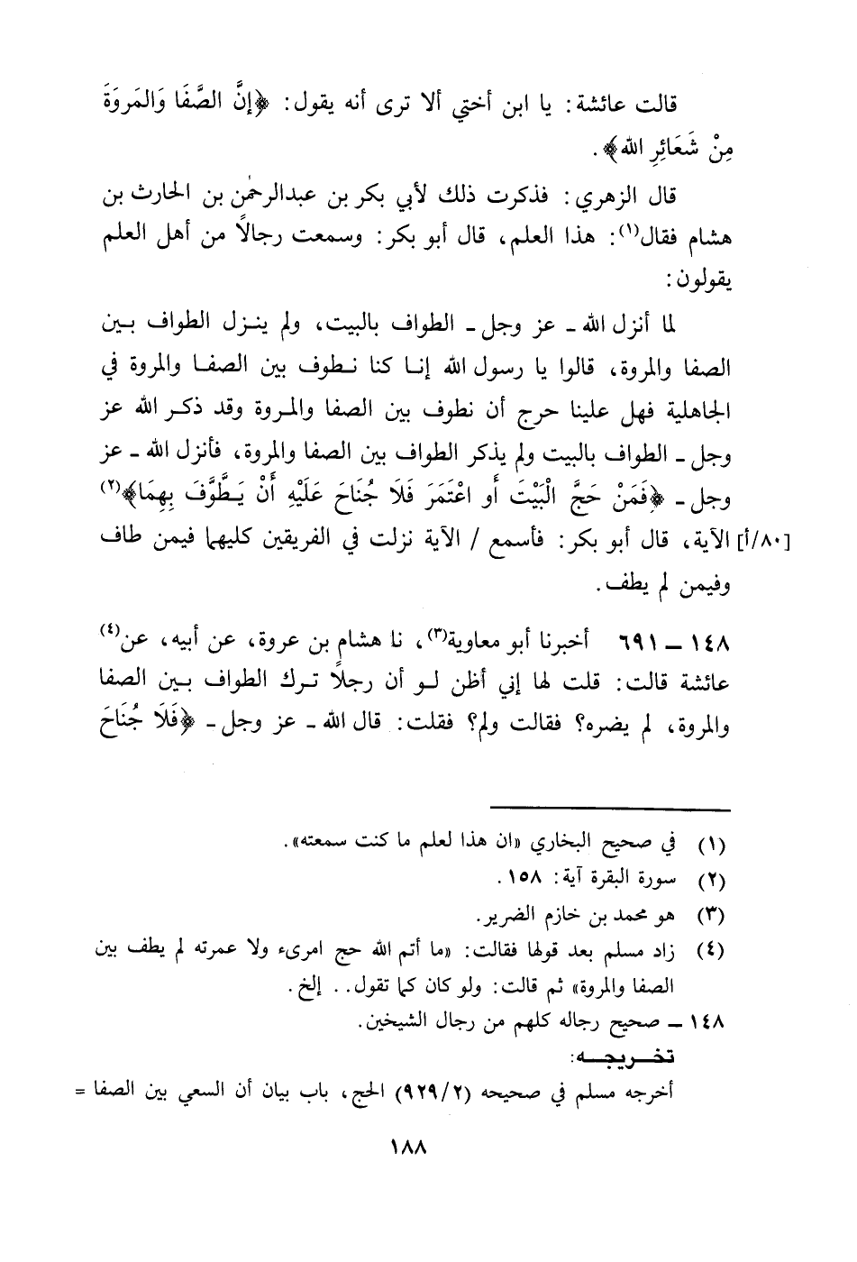 691 - أَخْبَرَنَا أَبُو مُعَاوِيَةَ، نا هِشَامُ بْنُ عُرْوَةَ، عَنْ أَبِيهِ، عَنْ عَائِشَةَ قَالَتْ: قُلْتُ لَهَا: إِنِّي أَظُنُّ لَوْ أَنَّ رَجُلًا تَرَكَ الطَّوَافَ بَيْنَ الصَّفَا وَالْمَرْوَةِ لَمْ يَضُرَّهُ؟ فَقَالَتْ: وَلِمَ؟ فَقُلْتُ: قَالَ اللَّهُ عَزَّ وَجَلَّ: {فَلَا جُنَاحَ عَلَيْهِ أَنْ يَطَّوَّفَ بِهِمَا} [البقرة: 158]