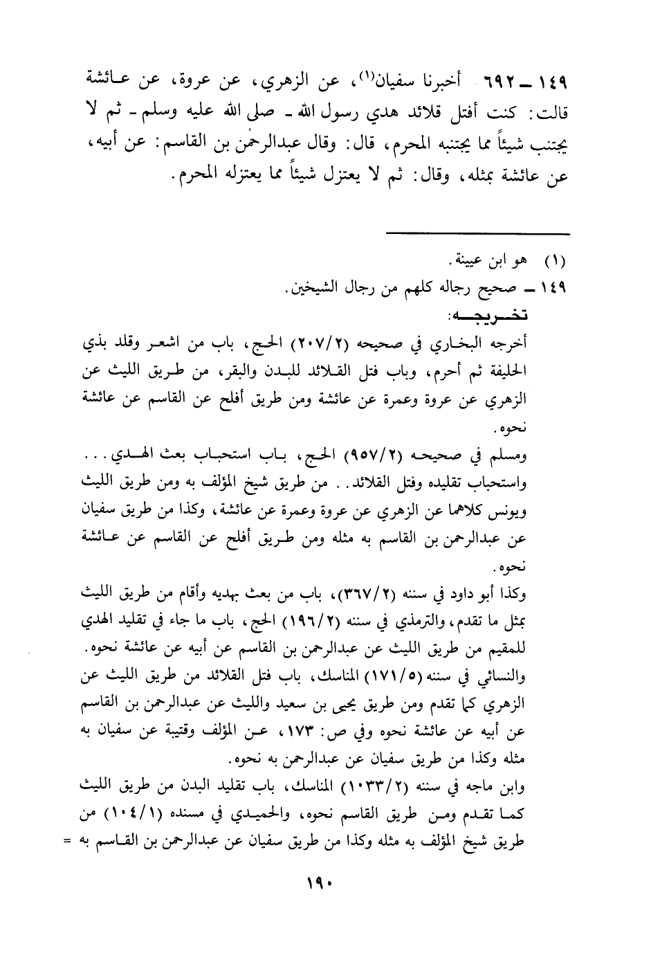 692 - أَخْبَرَنَا سُفْيَانُ، عَنِ الزُّهْرِيِّ، عَنْ عُرْوَةَ، عَنْ عَائِشَةَ، قَالَتْ: كُنْتُ أَفْتِلُ قَلَائِدَ هَدْيِ رَسُولِ اللَّهِ صَلَّى اللهُ عَلَيْهِ وَسَلَّمَ ثُمَّ §لَا يَجْتَنِبُ شَيْئًا مِمَّا يَجْتَنِبُهُ الْمُحْرِمُ، قَالَ: وَقَالَ عَبْدُ الرَّحْمَنِ بْنُ الْقَاسِمِ: عَنْ أَبِيهِ، عَنْ عَائِشَةَ بِمِثْلِهِ، وَقَالَ: ثُمَّ لَا يَعْتَزِلُ شَيْئًا مِمَّا يَعْتَزِلُهُ الْمُحْرِمُ