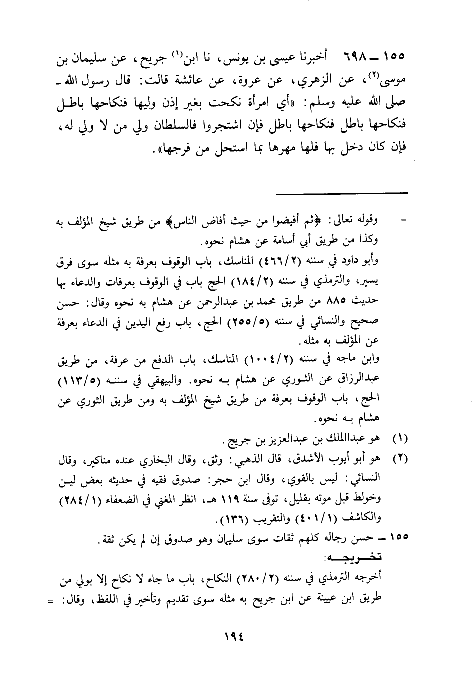 698 - أَخْبَرَنَا عِيسَى بْنُ يُونُسَ، نا ابْنُ جُرَيْجٍ، عَنْ سُلَيْمَانَ بْنِ مُوسَى، عَنِ الزُّهْرِيِّ، عَنْ عُرْوَةَ، عَنْ عَائِشَةَ قَالَتْ: قَالَ رَسُولُ اللَّهِ صَلَّى اللهُ عَلَيْهِ وَسَلَّمَ: «§أَيُّ امْرَأَةٍ نَكَحَتْ بِغَيْرِ إِذْنِ وَلِيِّهَا فَنِكَاحُهَا بَاطِلٌ، فَنِكَاحُهَا بَاطِلٌ، فَنِكَاحُهَا بَاطِلٌ، فَإِنِ اشْتَجَرُوا فَالسُّلْطَانُ وَلِيُّ مَنْ لَا وَلِيَّ لَهُ، فَإِنْ كَانَ دَخَلَ بِهَا، فَلَهَا مَهْرُهَا بِمَا اسْتَحَلَّ مِنْ فَرْجِهَا» ،