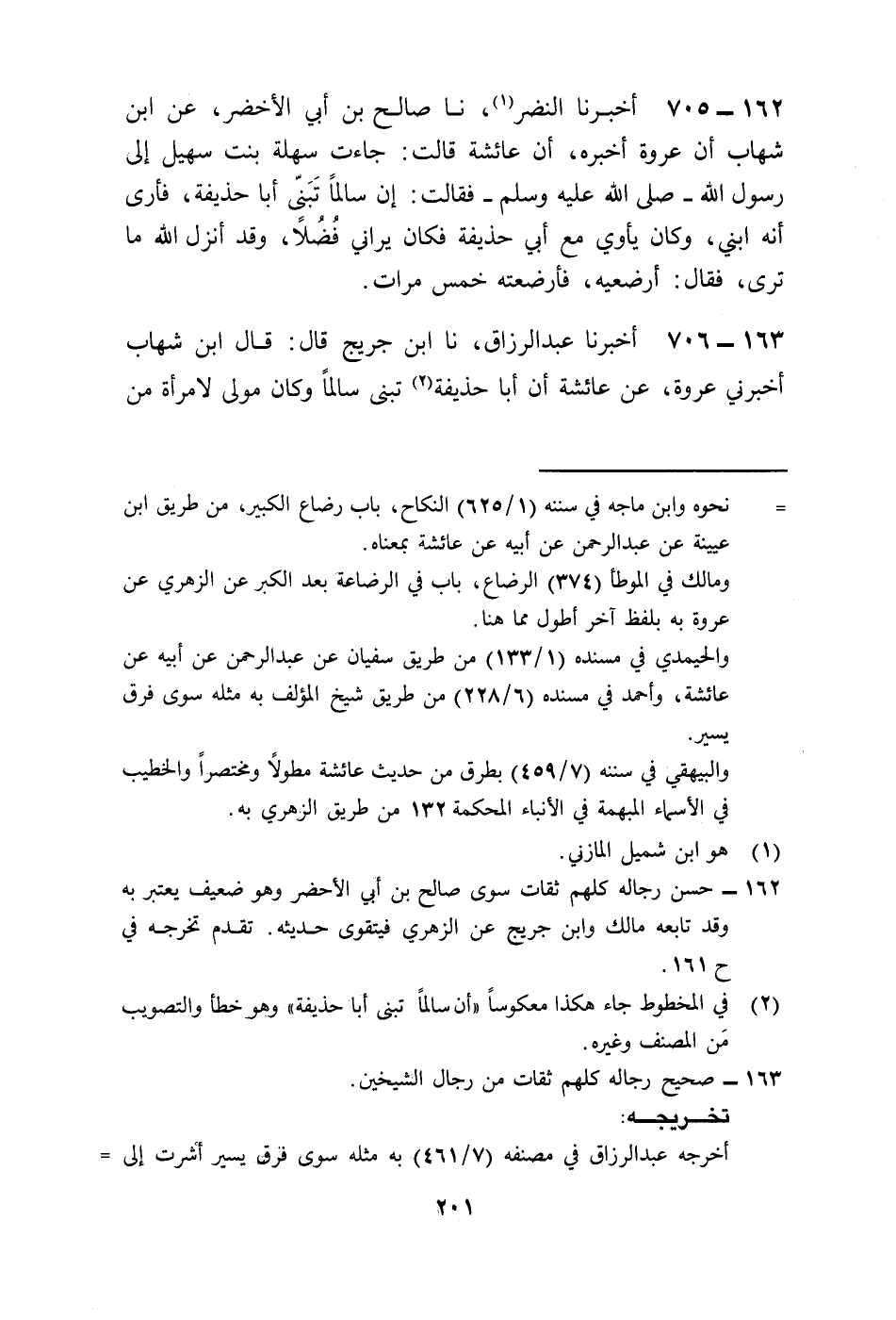 705 - أَخْبَرَنَا النَّضْرُ، نا صَالِحُ بْنُ أَبِي الْأَخْضَرِ، عَنِ ابْنِ شِهَابٍ أَنَّ عُرْوَةَ أَخْبَرَهُ أَنَّ عَائِشَةَ قَالَتْ: جَاءَتْ سَهْلَةُ بِنْتُ سُهَيْلٍ إِلَى رَسُولِ اللَّهِ صَلَّى اللهُ عَلَيْهِ وَسَلَّمَ فَقَالَتْ: إِنَّ أَبَا حُذَيْفَةَ تَبَنَّى سَالِمًا فَأَرَى أَنَّهُ ابْنِي، وَكَانَ يَأْوِي مَعَ أَبِي حُذَيْفَةَ، وَكَانَ يَرَانِي فُضُلًا وَقَدْ أَنْزَلَ اللَّهُ مَا تَرَى، فَقَالَ: «§أَرْضِعِيهِ» فَأَرْضَعْتُهُ خَمْسَ مَرَّاتٍ