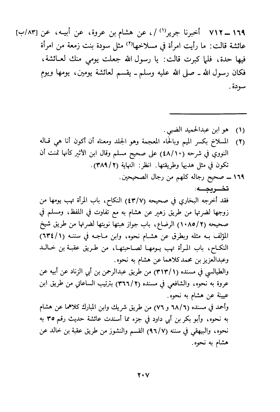 712 - أَخْبَرَنَا جَرِيرٌ، عَنْ هِشَامِ بْنِ عُرْوَةَ، عَنْ أَبِيهِ، عَنْ عَائِشَةَ قَالَتْ: " §مَا رَأَيْتُ امْرَأَةً فِي مِسْلَاخِهَا مِثْلَ سَوْدَةَ بِنْتِ زَمْعَةَ مِنِ امْرَأَةٍ فِيهَا حِدَّةٌ، فَلَمَّا كَبُرَتْ قَالَتْ: يَا رَسُولَ اللَّهِ، جَعَلْتُ يَوْمِي مِنْكَ لِعَائِشَةَ، فَكَانَ رَسُولُ اللَّهِ صَلَّى اللهُ عَلَيْهِ وَسَلَّمَ يُقْسِمُ لِعَائِشَةَ يَوْمَيْنِ يَوْمَهَا وَيَوْمَ سَوْدَةَ