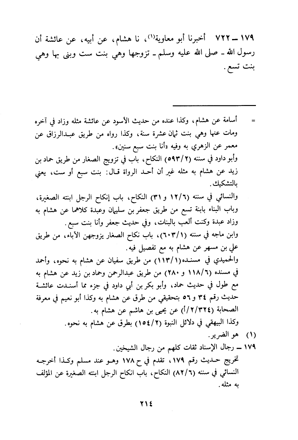 722 - أَخْبَرَنَا أَبُو مُعَاوِيَةَ، نا هِشَامٌ، عَنْ أَبِيهِ، عَنْ عَائِشَةَ أَنَّ رَسُولَ اللَّهِ صَلَّى اللهُ عَلَيْهِ وَسَلَّمَ §تَزَوَّجَهَا وَهِيَ بِنْتُ سِتٍّ، وَبَنَى بِهَا وَهِيَ بِنْتُ تِسْعٍ