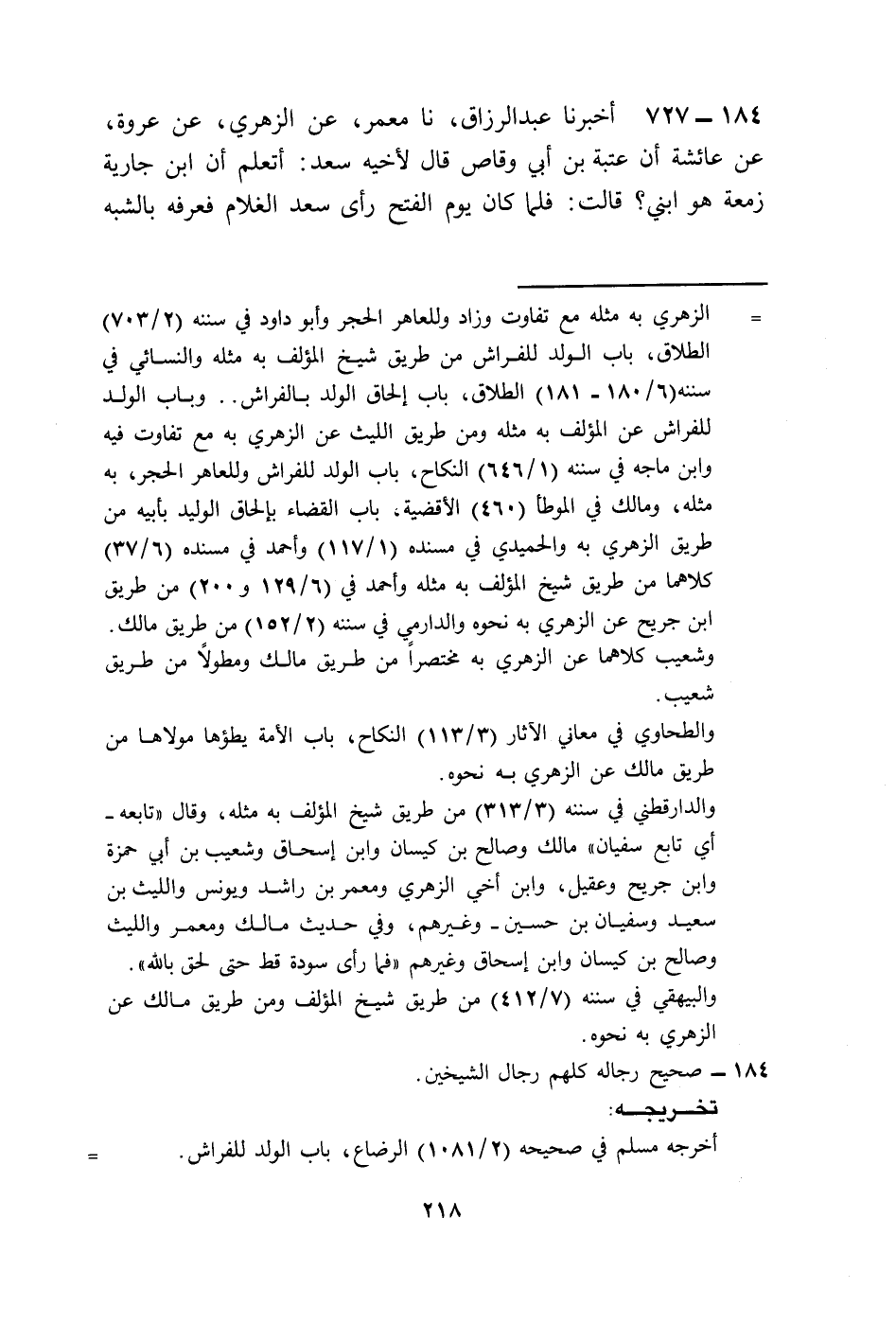 727 - أَخْبَرَنَا عَبْدُ الرَّزَّاقِ، نا مَعْمَرٌ، عَنِ الزُّهْرِيِّ، عَنْ عُرْوَةَ، عَنْ عَائِشَةَ أَنَّ عُتْبَةَ بْنَ أَبِي وَقَّاصٍ، قَالَ لِأَخِيهِ سَعْدٍ: أَتَعْلَمُ أَنَّ ابْنَ جَارِيَةِ زَمْعَةَ هُوَ ابْنِي، قَالَتْ: فَلَمَّا كَانَ يَوْمُ الْفَتْحِ رَأَى سَعْدٌ الْغُلَامَ فَعَرَفَهُ بِالشَّبَهِ فَاحْتَضَنَهُ، وَقَالَ: ابْنُ أَخِي وَرَبِّ الْكَعْبَةِ، وَقَالَ عَبْدُ بْنُ زَمْعَةَ هُوَ أَخِي مِنْ جَارِيَةِ أَبِي وُلِدَ عَلَى فِرَاشِهِ، قَالَ: فَانْطَلَقْنَا إِلَى رَسُولِ اللَّهِ صَلَّى اللهُ عَلَيْهِ وَسَلَّمَ فَقَالَ سَعْدٌ: ابْنُ أَخِي وَهُوَ أَشْبَهُ النَّاسِ بِعُتْبَةَ وَكَانَ أَبْيَنَ النَّاسِ شَبَهًا بِعُتْبَةَ، وَقَالَ عَبْدُ بْنُ زَمْعَةَ هُوَ أَخِي مِنْ جَارِيَةِ أَبِي، وُلِدَ عَلَى فِرَاشِ أَبِي، فَقَالَ رَسُولُ اللَّهِ صَلَّى اللهُ عَلَيْهِ وَسَلَّمَ «§الْوَلَدُ لِلْفِرَاشِ وَاحْتَجِبِي مِنْهُ يَا سَوْدَةُ» لِمَا رَأَى مِنْ شَبَهٍ بِعُتْبَةَ، قَالَتْ: فَمَا رَآهَا حَتَّى فَارَقَ الدُّنْيَا