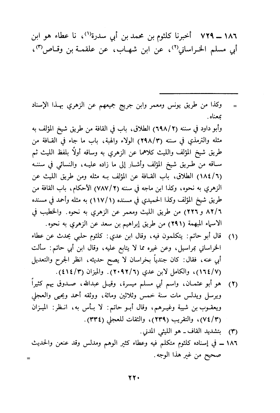 729 - أَخْبَرَنَا كُلْثُومُ بْنُ مُحَمَّدِ بْنِ أَبِي سِدْرَةَ، نا عَطَاءٌ هُوَ ابْنُ أَبِي مُسْلِمٍ الْخُرَاسَانِي، عَنِ ابْنِ شِهَابٍ، عَنْ عَلْقَمَةَ بْنِ وَقَّاصٍ -[221]-، وَعُرْوَةَ بْنِ الزُّبَيْرِ، عَنْ عَائِشَةَ أَنَّ رَسُولَ اللَّهِ صَلَّى اللهُ عَلَيْهِ وَسَلَّمَ كَانَ §إِذَا سَافَرَ أَقْرَعَ بَيْنَ نِسَائِهِ، فَأَيُّهُنَّ خَرَجَ سَهْمُهَا خَرَجَ بِهَا مَعَهُ