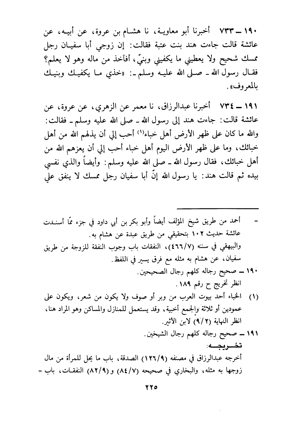 734 - أَخْبَرَنَا عَبْدُ الرَّزَّاقِ، نا مَعْمَرٌ، عَنِ الزُّهْرِيِّ، عَنْ عُرْوَةَ، عَنْ عَائِشَةَ، قَالَتْ: جَاءَتْ هِنْدُ إِلَى رَسُولِ اللَّهِ صَلَّى اللهُ عَلَيْهِ وَسَلَّمَ فَقَالَتْ: وَاللَّهِ مَا كَانَ عَلَى ظَهْرِ الْأَرْضِ أَهْلُ خِبَاءٍ أَحَبُّ إِلَيَّ أَنْ يُذِلَّهُمُ اللَّهُ مِنْ أَهْلِ خِبَائِكَ، وَمَا عَلَى ظَهْرِ الْأَرْضِ الْيَوْمَ أَهْلُ خِبَاءٍ أَحَبُّ إِلَيَّ أَنْ يُعِزَّهُمُ اللَّهُ مِنْ أَهْلِ خِبَائِكَ، فَقَالَ رَسُولُ اللَّهِ صَلَّى اللهُ عَلَيْهِ وَسَلَّمَ: «وَأَيْضًا وَالَّذِي نَفْسِي بِيَدِهِ» ، ثُمَّ قَالَتْ هِنْدُ: يَا رَسُولَ اللَّهِ، إِنَّ أَبَا سُفْيَانَ رَجُلٌ مُمْسِكٌ، لَا يُنْفِقُ عَلَيَّ وَعَلَى عِيَالِي، فَهَلْ عَلَيَّ حَرَجٌ أَنْ أُنْفِقَ عَلَى عِيَالِي بِغَيْرِ إِذْنِهِ؟ فَقَالَ رَسُولُ اللَّهِ صَلَّى اللهُ عَلَيْهِ وَسَلَّمَ: «§لَا حَرَجَ عَلَيْكِ أَنْ تُنْفِقِي عَلَيْهِمْ بِالْمَعْرُوفِ»