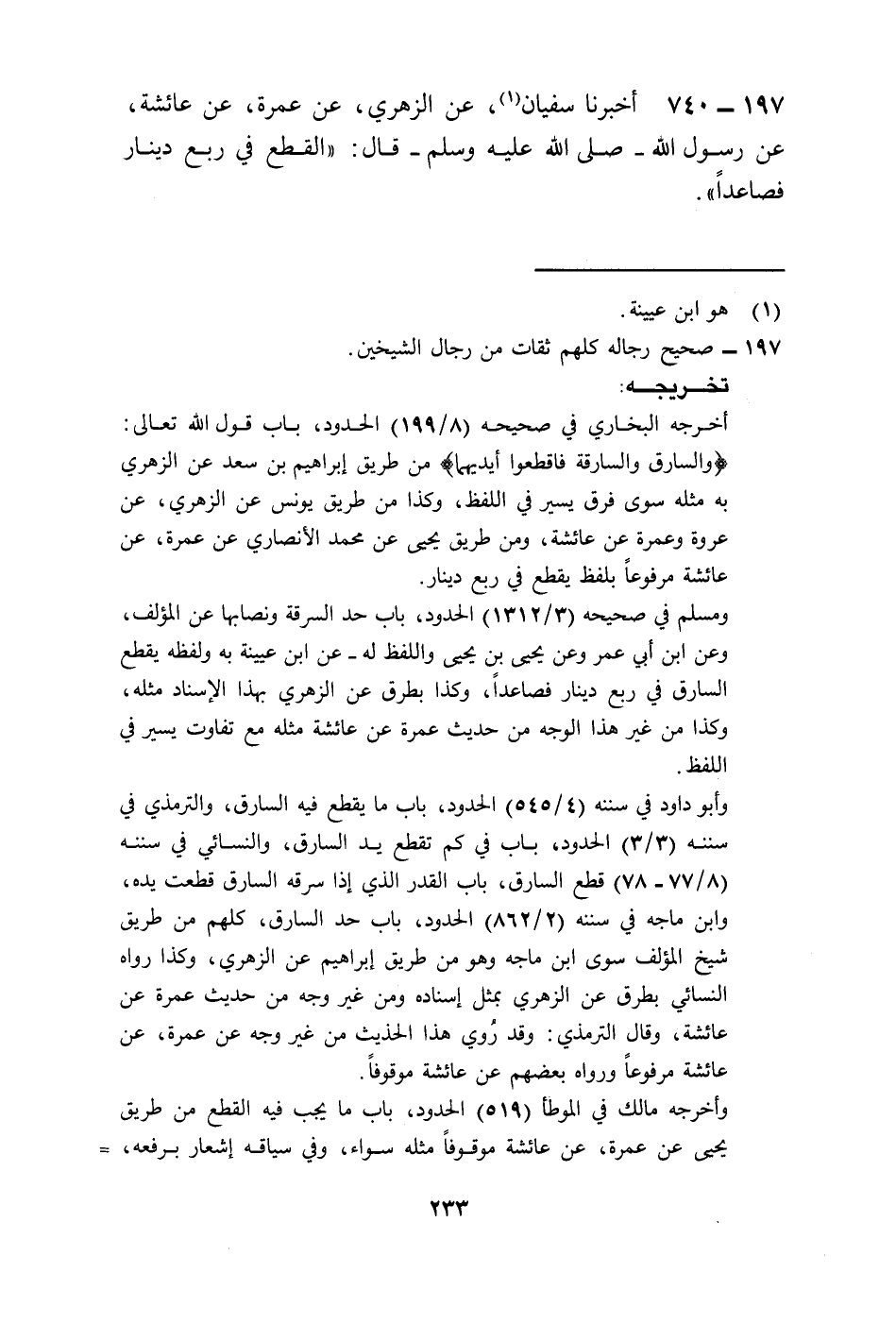 740 - أَخْبَرَنَا سُفْيَانُ، عَنِ الزُّهْرِيِّ، عَنْ عَمْرَةَ، عَنْ عَائِشَةَ، عَنْ رَسُولِ اللَّهِ صَلَّى اللهُ عَلَيْهِ وَسَلَّمَ قَالَ «§الْقَطْعُ فِي رُبْعِ دِينَارٍ فَصَاعِدًا»