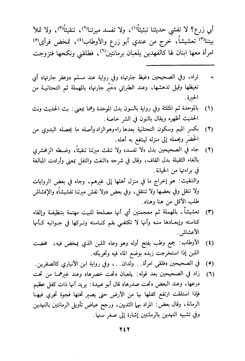 لاَ تُفْشِي حَدِيثَنَا تَبْثِيثًا ، وَلاَ تُفْسِدُ مِيرَتَنَا تَنْقِيثًا ، وَلاَ تَمْلأُ بَيْتَنَا تَعْشِيشًا ، خَرَجَ مِنْ عِنْدِي أَبُو زَرْعٍ وَالأَوْطَابُ تُمْخَضُ ، فَرَأَى امْرَأَةً مَعَهَا ابْنَانِ لَهَا ، كَالْفَهْدَيْنِ يَلْعَبَانِ بِرُمَّانَتَيْنِ ، فَطَلَّقَنِي وَنَكَحَهَا ، فَتَزَوَّجْتُ بَعْدَهُ شَابًا سَخِيًّا ، فَخَرَجَ شَرِيًّا ، وَأَخَذَ خَطِّيًّا ، وَسَاقَ مِنْ كُلِ سَائِمَةٍ زَوْجًا ، فَقَالَ : مِيرِي بِهَذَا أَهْلَكِ يَا أُمَّ زَرْعٍ ، فَقُلْتُ : لَوْ جَعَلْتُ هَذَا كُلَّهُ فِي أَدْنَى وِعَاءٍ لأَبِي زَرْعٍ لَمْ يَمْلأْهُ.