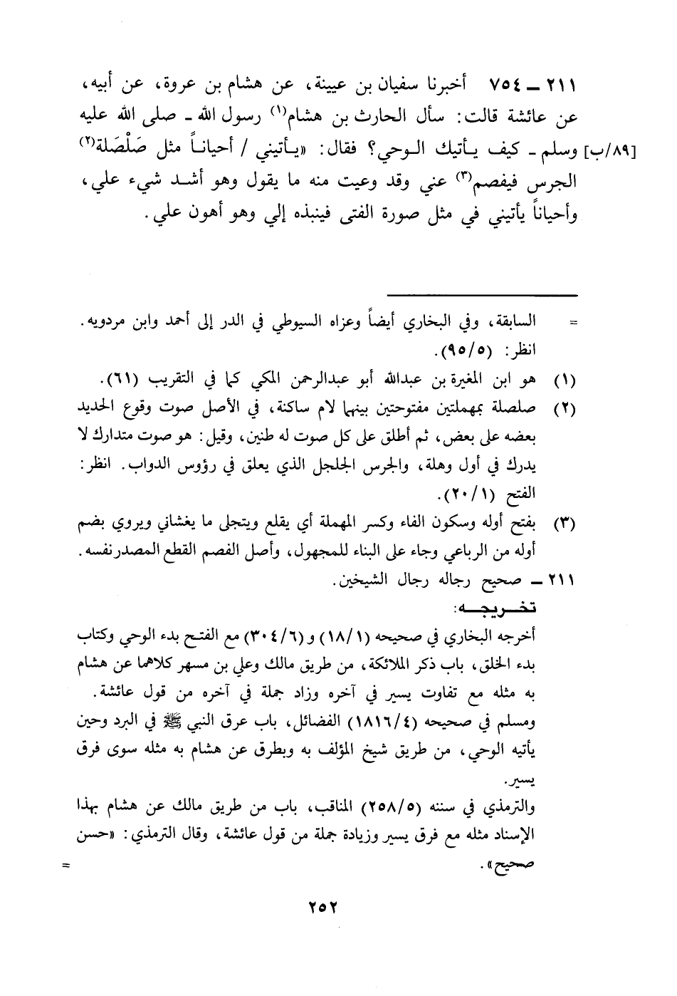 754 - أَخْبَرَنَا سُفْيَانُ بْنُ عُيَيْنَةَ، عَنْ هِشَامِ بْنِ عُرْوَةَ، عَنْ أَبِيهِ، عَنْ عَائِشَةَ، قَالَتْ: سَأَلَ الْحَارِثُ بْنُ هِشَامٍ رَسُولَ اللَّهِ صَلَّى اللهُ عَلَيْهِ وَسَلَّمَ كَيْفَ يَأْتِيكَ الْوَحْيُ، فَقَالَ: «§يَأْتِينِي أَحْيَانًا مِثْلَ صَلْصَلَةِ الْجَرَسِ، فَيَفْصِمُ عَنِّي وَقَدْ وَعَيْتُ مِنْهُ مَا يَقُولُ وَهُوَ أَشَدُّ شَيْءٍ عَلَيَّ، وَأَحْيَانًا يَأْتِينِي فِي مِثْلِ صُورَةِ الْفَتَى فَيَنْبِذُهُ إِلَيَّ وَهُوَ أَهْوَنُ عَلَيَّ»