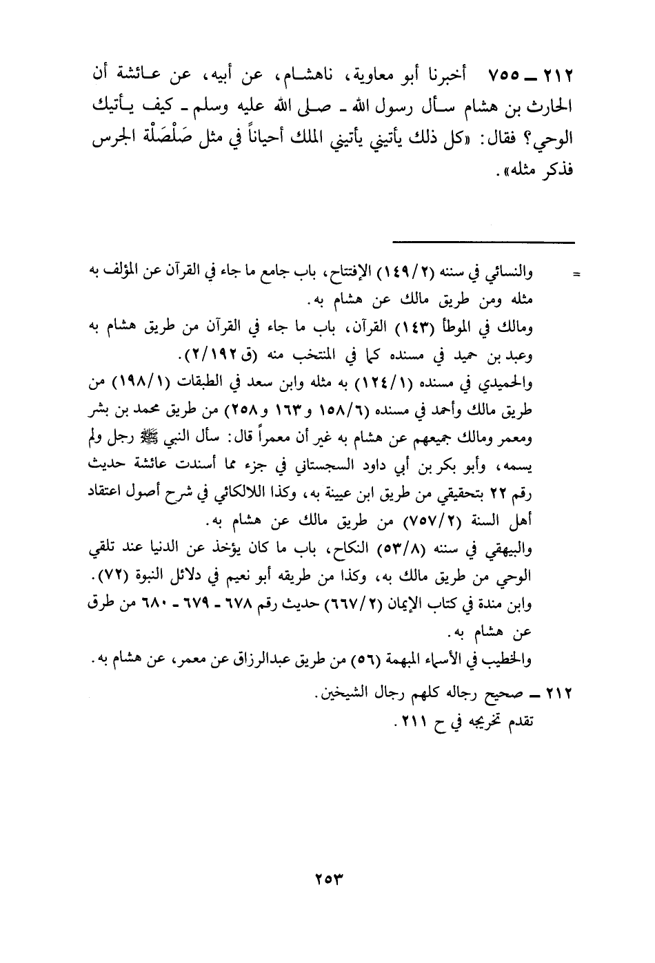 755- أَخْبَرَنَا أَبُو مُعَاوِيَةَ ، حَدَّثَنَا هِشَامٌ ، عَنْ أَبِيهِ , عَنْ عَائِشَةَ ؛ أَنَّ الْحَارِثَ بْنَ هِشَامٍ سَأَلَ رَسُولَ اللَّهِ صَلَّى اللَّهُ عَلَيْهِ وَسَلَّمَ : كَيْفَ يَأْتِيكَ الْوَحْيُ ؟ فَقَالَ : كُلُّ ذَلِكَ يَأْتِينِي ، يَأْتِينِي الْمَلَكُ أَحْيَانًا فِي مِثْلِ صَلْصَلَةِ الْجَرَسِ ، فَذَكَرَ مِثْلَهَ.