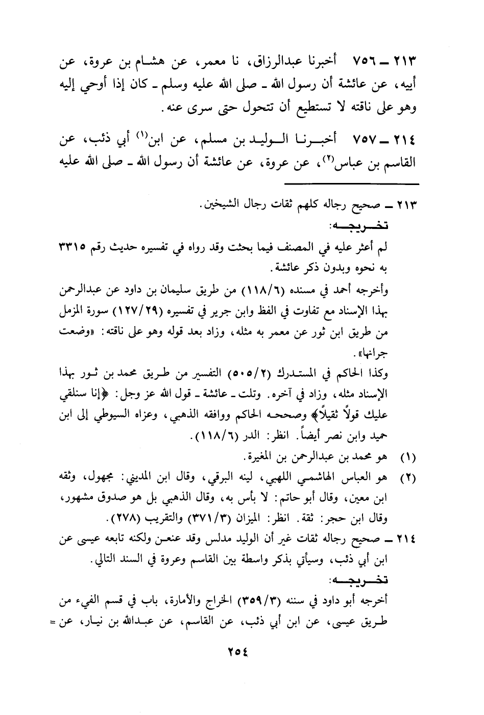 756 - أَخْبَرَنَا عَبْدُ الرَّزَّاقِ، نا مَعْمَرٌ، عَنْ هِشَامِ بْنِ عُرْوَةَ، عَنْ أَبِيهِ، عَنْ عَائِشَةَ أَنَّ رَسُولَ اللَّهِ صَلَّى اللهُ عَلَيْهِ وَسَلَّمَ كَانَ §إِذَا أُوحِيَ إِلَيْهِ وَهُوَ عَلَى نَاقَتِهِ لَا تَسْتَطِيعُ أَنْ تَتَحَوَّلَ حَتَّى سُرِّيَ عَنْهُ