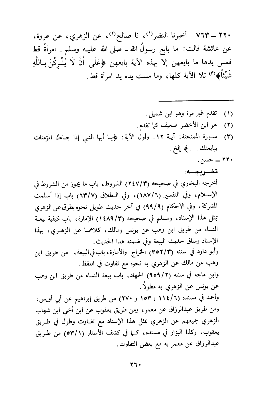 763 - أَخْبَرَنَا النَّضْرُ، نا صَالِحٌ، عَنِ الزُّهْرِيِّ، عَنْ عُرْوَةَ، عَنْ عَائِشَةَ، قَالَتْ: مَا بَايَعَ رَسُولُ اللَّهِ صَلَّى اللهُ عَلَيْهِ وَسَلَّمَ امْرَأَةً قَطُّ، فَمَسَّ يَدَهَا، مَا بَايَعَهُنَّ إِلَّا بِهَذِهِ الْآيَةِ، §بَايَعَهُنَّ {عَلَى أَنْ لَا يُشْرِكْنَ بِاللَّهِ شَيْئًا} [الممتحنة: 12] تَلَا الْآيَةَ كُلَّهَا وَمَا مَسَّتْ يَدُهُ يَدَ امْرَأَةٍ قَطُّ