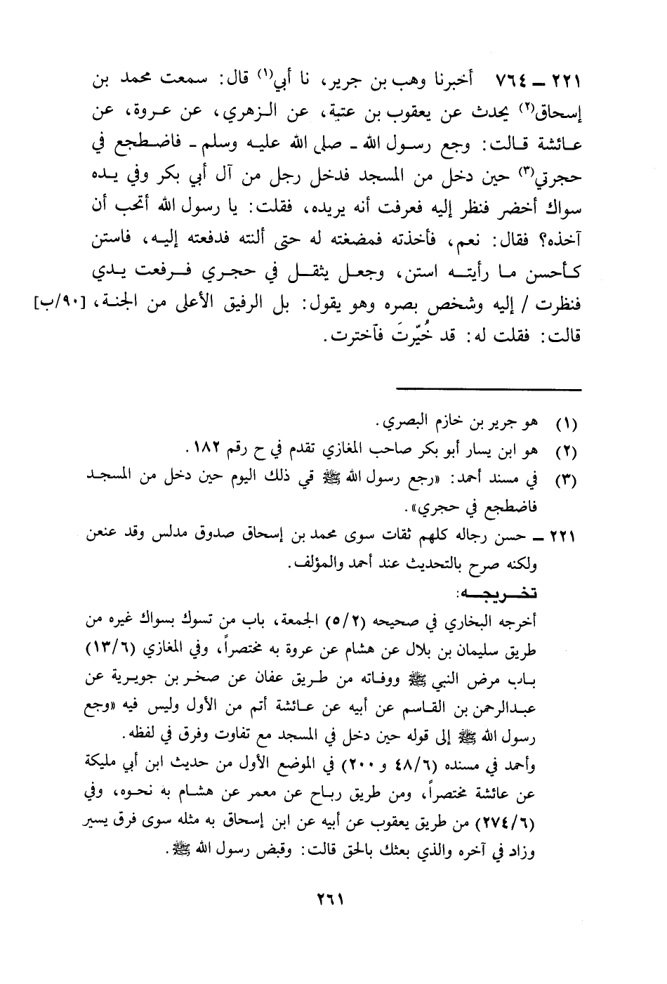 764 - أَخْبَرَنَا وَهْبُ بْنُ جَرِيرٍ، نا أَبِي قَالَ: سَمِعْتُ مُحَمَّدَ بْنَ إِسْحَاقَ يُحَدِّثُ عَنْ يَعْقُوبَ بْنِ عُتْبَةَ، عَنِ الزُّهْرِيِّ، عَنْ عُرْوَةَ، عَنْ عَائِشَةَ، قَالَتْ: وَجِعَ رَسُولُ اللَّهِ صَلَّى اللهُ عَلَيْهِ وَسَلَّمَ فَاضْطَجَعَ فِي حُجْرَتِي حِينَ دَخَلَ مِنَ الْمَسْجِدِ فَدَخَلَ رَجُلٌ مِنْ آلِ أَبِي بَكْرٍ وَفِي يَدِهِ سِوَاكٌ أَخْضَرُ، فَنَظَرَ إِلَيْهِ، فَعَرِفْتُ أَنَّهُ يُرِيدُهُ، فَقُلْتُ: يَا رَسُولَ اللَّهِ، أَتُحِبُّ أَنْ آخُذَهُ، فَقَالَ: نَعَمْ، فَأَخَذْتُهُ فَمَضَغْتُهُ لَهُ حَتَّى أَلَنْتُهُ، فَدَفَعْتُهُ إِلَيْهِ فَاسْتَنَّ كَأَحْسَنِ مَا رَأَيْتُهُ اسْتَنَّ، وَجَعَلَ يَثْقُلُ فِي حِجْرِي، فَرَفَعْتُ يَدَيَّ فَنَظَرْتُ إِلَيْهِ وَشَخَصَ بَصَرُهُ، وَهُوَ يَقُولُ: «§بَلِ الرَّفِيقُ الْأَعْلَى مِنَ الْجَنَّةِ» ، قَالَتْ: فَقُلْتُ لَهُ: قَدْ خُيِّرْتَ فَاخْتَرْتَ