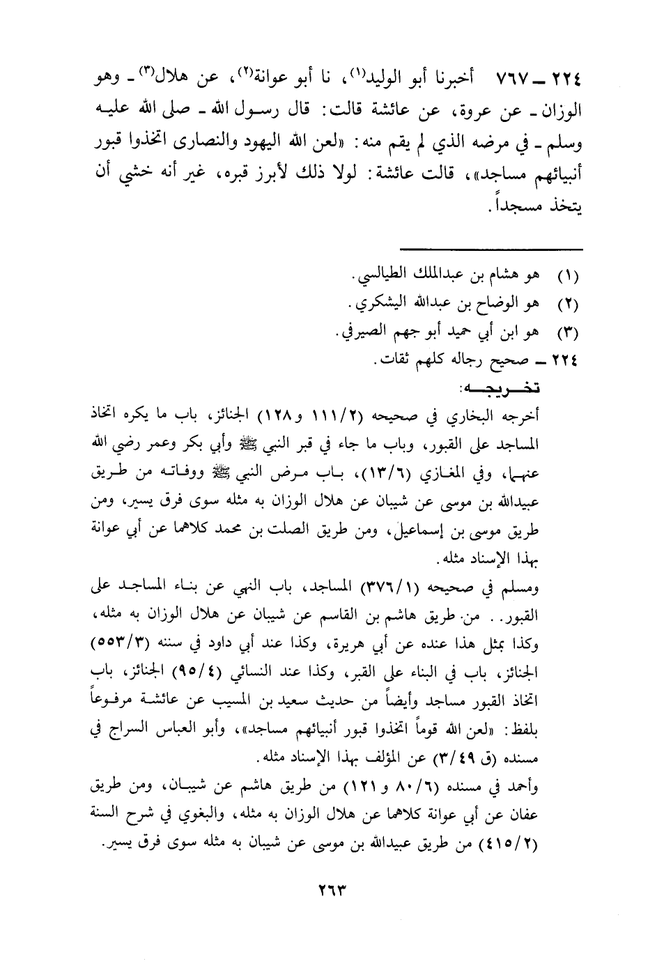 767 - أَخْبَرَنَا أَبُو الْوَلِيدِ، نا أَبُو عَوَانَةَ، عَنْ هِلَالٍ وَهُوَ الْوَزَّانُ، عَنْ عُرْوَةَ، عَنْ عَائِشَةَ، قَالَتْ: قَالَ رَسُولُ اللَّهِ صَلَّى اللهُ عَلَيْهِ وَسَلَّمَ فِي مَرَضِهِ الَّذِي لَمْ يَقُمْ مِنْهُ: «§لَعَنَ اللَّهُ الْيَهُودَ وَالنَّصَارَى اتَّخَذُوا قُبُورَ أَنْبِيَائِهِمْ مَسَاجِدَ» قَالَتْ عَائِشَةُ: لَوْلَا ذَلِكَ لَأُبْرِزَ قَبْرُهُ غَيْرَ أَنَّهُ خَشِيَ أَنْ يُتَّخَذَ مَسْجِدًا