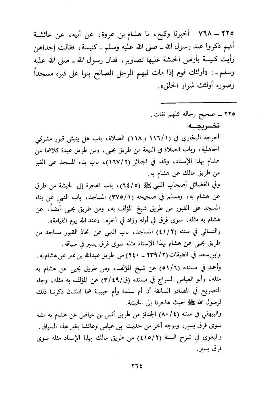 768 - أَخْبَرَنَا وَكِيعٌ، نا هِشَامُ بْنُ عُرْوَةَ، عَنْ أَبِيهِ، عَنْ عَائِشَةَ أَنَّهُمْ ذَكَرُوا عِنْدَ رَسُولِ اللَّهِ صَلَّى اللهُ عَلَيْهِ وَسَلَّمَ كَنِيسَةً، فَقَالَتْ إِحْدَاهُنَّ: رَأَيْتُ كَنِيسَةً بِأَرْضِ الْحَبَشَةِ عَلَيْهَا تَصَاوِيرُ، فَقَالَ رَسُولُ اللَّهِ صَلَّى اللهُ عَلَيْهِ وَسَلَّمَ: «§أُولَئِكَ قَوْمٌ إِذَا مَاتَ فِيهِمُ الرَّجُلُ الصَّالِحُ بَنَوْا عَلَى قَبْرِهِ مَسْجِدًا وَصَوَّرَهُ أُولَئِكَ شِرَارُ الْخَلْقِ» ،