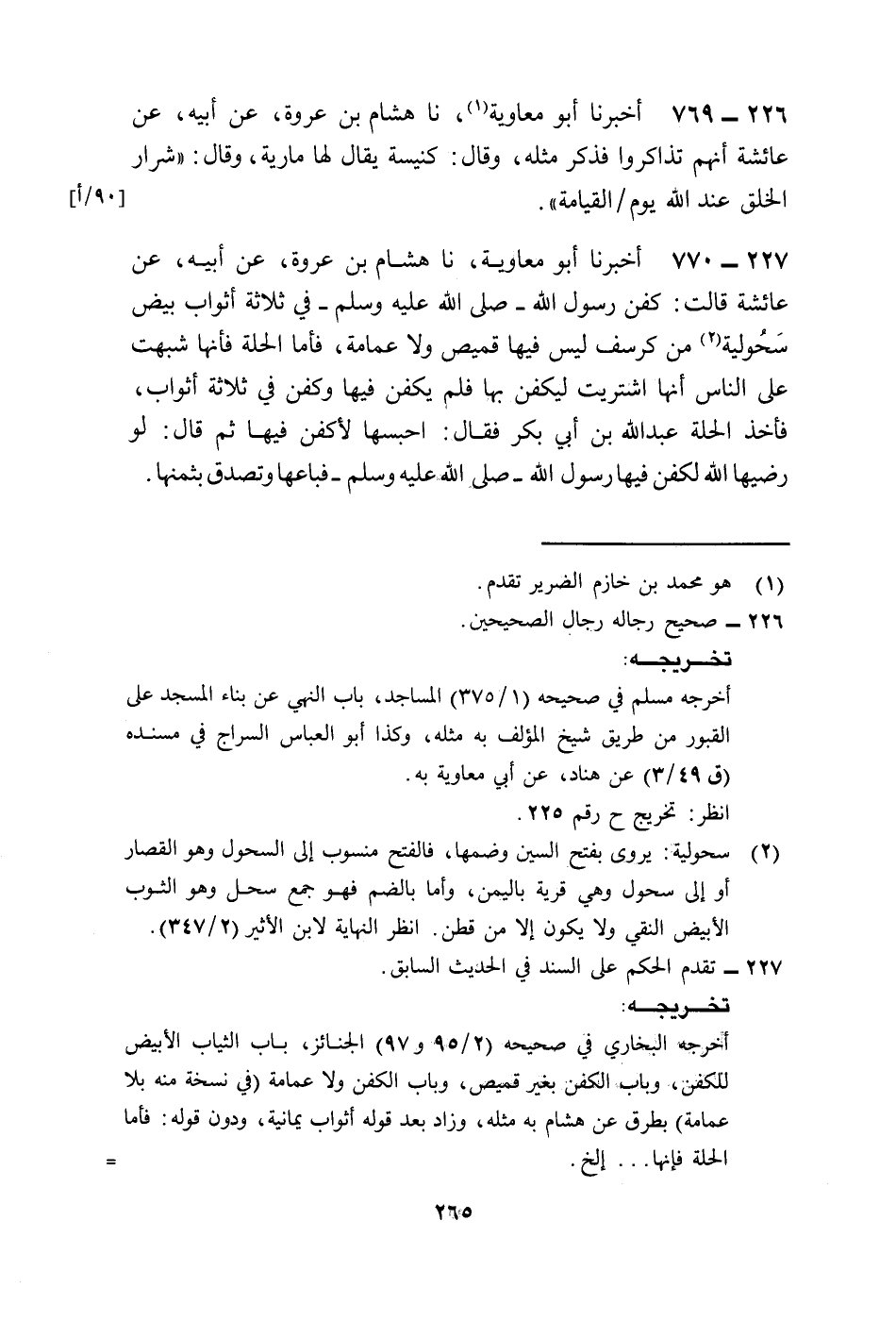 770 - أَخْبَرَنَا أَبُو مُعَاوِيَةَ، نا هِشَامُ بْنُ عُرْوَةَ، عَنْ أَبِيهِ، عَنْ عَائِشَةَ، قَالَتْ: " §كُفِّنَ رَسُولُ اللَّهِ صَلَّى اللهُ عَلَيْهِ وَسَلَّمَ فِي ثَلَاثَةِ أَثْوَابٍ بِيضٍ سَحُولِيَّةٍ مِنْ كُرْسُفٍ لَيْسَ فِيهَا قَمِيصٌ وَلَا عِمَامَةٌ، فَأَمَّا الْحُلَّةُ فَإِنَّهَا شُبِّهَتْ عَلَى النَّاسِ أَنَّهَا اشْتُرِيَتْ لِيُكَفَّنَ بِهَا فَلَمْ يُكَفَّنَ فِيهَا وَكُفِّنَ فِي ثَلَاثَةِ أَثْوَابٍ، فَأَخَذَ الْحُلَّةَ عَبْدُ اللَّهِ بْنُ أَبِي بَكْرٍ فَقَالَ: أَحْبِسُهَا لِأُكَفَّنَ فِيهَا، ثُمَّ قَالَ: لَوْ رَضِيَهَا اللَّهُ لَكُفِّنَ فِيهَا رَسُولُ اللَّهِ صَلَّى اللهُ عَلَيْهِ وَسَلَّمَ فَبَاعَهَا وَتَصَدَّقَ بِثَمَنِهَا "