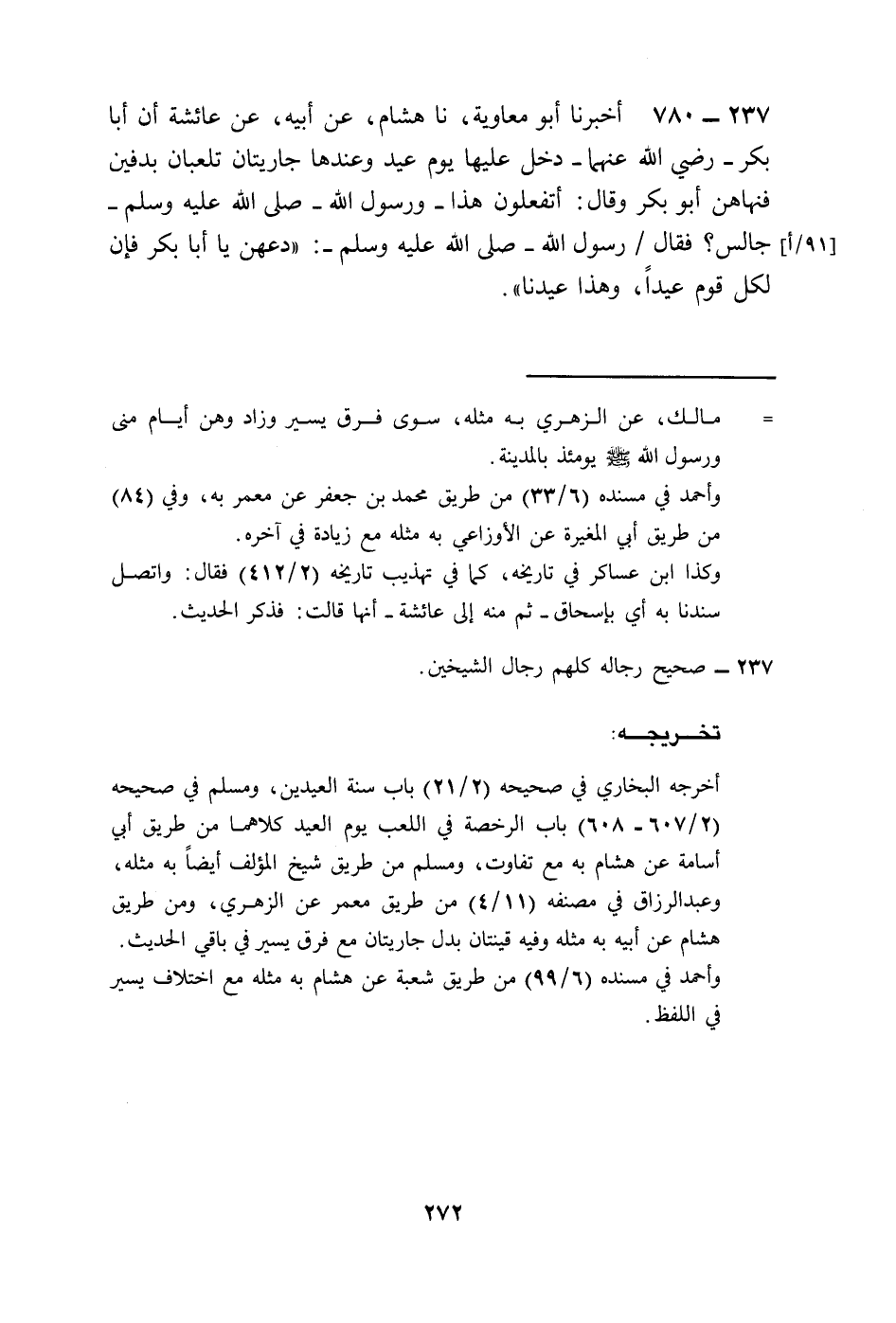 780 - أَخْبَرَنَا أَبُو مُعَاوِيَةَ، نا هِشَامٌ، عَنْ أَبِيهِ، عَنْ عَائِشَةَ أَنَّ أَبَا بَكْرٍ رَضِيَ اللَّهُ عَنْهُمَا دَخَلَ عَلَيْهَا يَوْمَ عِيدٍ وَعِنْدَهَا جَارِيَتَانِ تَلْعَبَانِ بِدُفَّيْنِ فَنَهَاهُنَّ أَبُو بَكْرٍ، وَقَالَ: أَتَفْعَلُونَ هَذَا وَرَسُولُ اللَّهِ صَلَّى اللهُ عَلَيْهِ وَسَلَّمَ جَالِسٌ، فَقَالَ رَسُولُ اللَّهِ صَلَّى اللهُ عَلَيْهِ وَسَلَّمَ: «§دَعْهُنَّ يَا أَبَا بَكْرٍ، فَإِنَّ لِكُلِّ قَوْمٍ عِيدًا وَهَذَا عِيدُنَا»