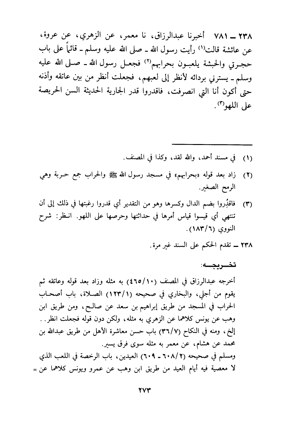 781 - أَخْبَرَنَا عَبْدُ الرَّزَّاقِ، نا مَعْمَرٌ، عَنِ الزُّهْرِيِّ، عَنْ عُرْوَةَ، عَنْ عَائِشَةَ، قَالَتْ: رَأَيْتُ رَسُولَ اللَّهِ صَلَّى اللهُ عَلَيْهِ وَسَلَّمَ قَائِمًا عَلَى بَابِ حُجْرَتِي وَالْحَبَشَةُ يَلْعَبُونَ بِحِرَابِهِمْ، §فَجَعَلَ رَسُولُ اللَّهِ صَلَّى اللهُ عَلَيْهِ وَسَلَّمَ يَسْتُرُنِي بِرِدَائِهِ لِأَنْظُرَ إِلَى لَعِبِهِمْ، فَجَعَلْتُ أَنْظُرُ مِنْ بَيْنِ عَاتِقِهِ وَأُذُنِهِ حَتَّى أَكُونَ أَنَا الَّتِي انْصَرَفْتُ فَاقْدُرُوا قَدْرَ الْجَارِيَةِ الْحَدِيثَةِ السِّنِّ الْحَرِيصَةِ عَلَى اللَّهْوِ