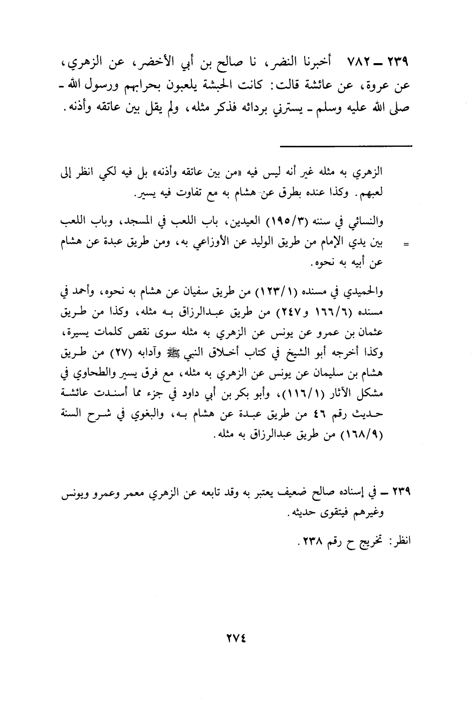 782- أَخْبَرَنَا النَّضْرُ ، حَدَّثَنَا صَالِحُ بْنُ أَبِي الأَخْضَرِ ، عَنِ الزُّهْرِيِّ ، عَنْ عُرْوَةَ ، عَنْ عَائِشَةَ ، قَالَتْ : كَانَتِ الْحَبَشَةُ يَلْعَبُونَ بِحِرَابِهِمْ ، وَرَسُولُ اللَّهِ صَلَّى اللَّهُ عَلَيْهِ وَسَلَّمَ يَسْتُرُنِي بِرِدَائِهِ ، فَذَكَرَ مِثْلَهُ ، وَلَمْ يَقُلْ : بَيْنَ عَاتِقِهِ وَأُذُنِهِ.
