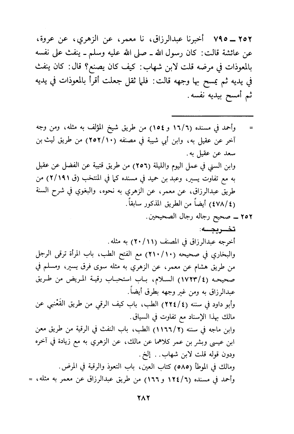 795 - أَخْبَرَنَا عَبْدُ الرَّزَّاقِ، نا مَعْمَرٌ، عَنِ الزُّهْرِيِّ، عَنْ عُرْوَةَ، عَنْ عَائِشَةَ، قَالَتْ: كَانَ رَسُولُ اللَّهِ صَلَّى اللهُ عَلَيْهِ وَسَلَّمَ §يَنْفُثُ عَلَى نَفْسِهِ بِالْمُعَوِّذَاتِ فِي مَرَضِهِ، قُلْتُ لِابْنِ شِهَابٍ: كَيْفَ كَانَ يَصْنَعُ؟ قَالَ: كَانَ يَنْفُثُ فِي يَدَيْهِ، ثُمَّ يَمْسَحُ بِهَا وَجْهَهُ، قَالَتْ: فَلَمَّا ثَقُلَ جَعَلْتُ أَقْرَأُ بِالْمُعَوِّذَاتِ فِي يَدَيْهِ ثُمَّ أَمْسَحُ بِيَدَيْهِ نَفْسَهُ