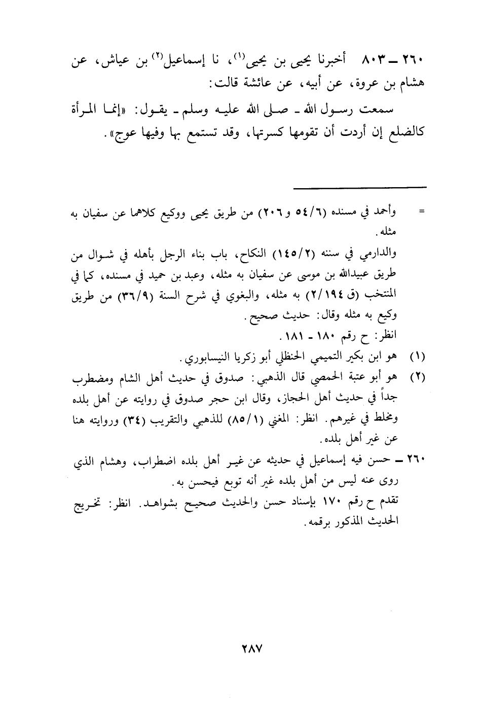 803 - أَخْبَرَنَا يَحْيَى بْنُ يَحْيَى، نا إِسْمَاعِيلُ بْنُ عَيَّاشٍ، عَنْ هِشَامِ بْنِ عُرْوَةَ، عَنْ أَبِيهِ، عَنْ عَائِشَةَ، قَالَتْ: سَمِعْتُ رَسُولَ اللَّهِ صَلَّى اللهُ عَلَيْهِ وَسَلَّمَ يَقُولُ: «إِنَّمَا §الْمَرْأَةُ كَالضِّلْعِ إِنْ أَرَدْتَ أَنْ تُقَوِّمَهَا كَسَرْتَهَا وَقَدْ تَسْتَمْتِعُ بِهَا وَفِيهَا عِوَجٌ»