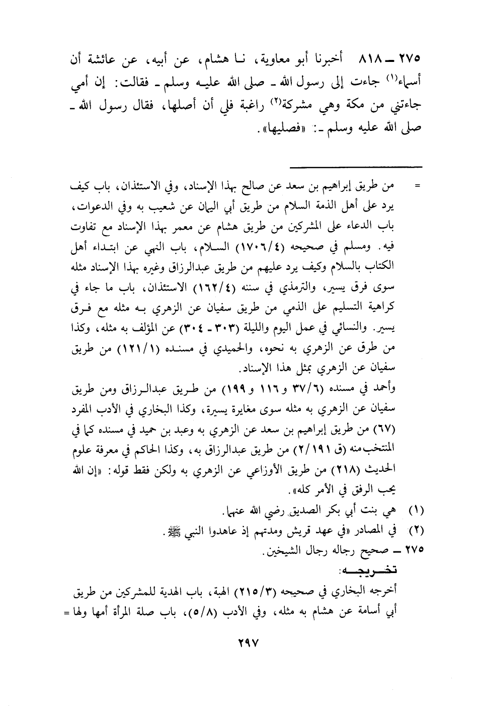 818 - أَخْبَرَنَا أَبُو مُعَاوِيَةَ، نا هِشَامٌ، عَنْ أَبِيهِ، عَنْ عَائِشَةَ، أَنَّ أَسْمَاءَ، جَاءَتْ إِلَى رَسُولِ اللَّهِ صَلَّى اللهُ عَلَيْهِ وَسَلَّمَ فَقَالَتْ: إِنَّ §أُمِّي جَاءَتْنِي مِنْ مَكَّةَ، وَهِيَ مُشْرِكَةٌ رَاغِبَةٌ، فَلِي أَنْ أَصِلَهَا؟ فَقَالَ رَسُولُ اللَّهِ صَلَّى اللهُ عَلَيْهِ وَسَلَّمَ: «فَصِلِيهَا»