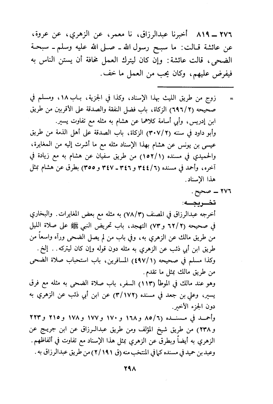 819 - أَخْبَرَنَا عَبْدُ الرَّزَّاقِ، نا مَعْمَرٌ، عَنِ الزُّهْرِيِّ، عَنْ عُرْوَةَ، عَنْ عَائِشَةَ، قَالَتْ §مَا سَبَّحَ رَسُولُ اللَّهِ صَلَّى اللهُ عَلَيْهِ وَسَلَّمَ سُبْحَةَ الضُّحَى قَالَتْ عَائِشَةُ وَإِنْ كَانَ لِيَتْرُكَ الْعَمَلَ مَخَافَةَ أَنْ يَسْتَنَّ النَّاسُ بِهِ فَيُفْرَضَ عَلَيْهِمْ وَكَانَ يُحِبُّ مِنَ الْعَمَلِ مَا خَفَّ