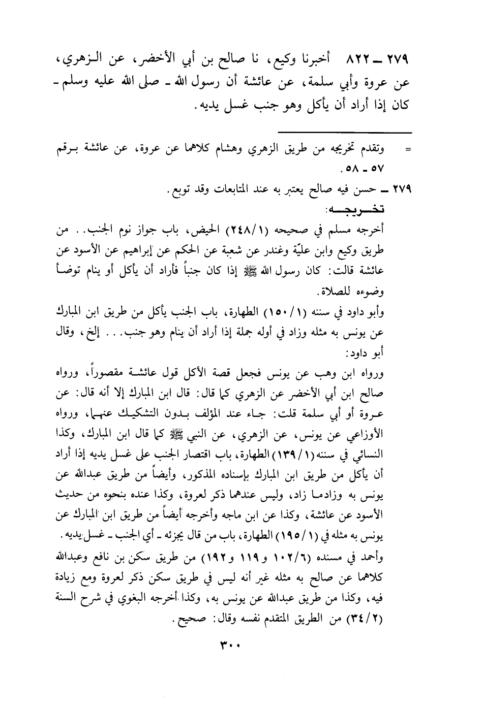 822 - أَخْبَرَنَا وَكِيعٌ، نا صَالِحُ بْنُ أَبِي الْأَخْضَرِ، عَنِ الزُّهْرِيِّ، عَنْ عُرْوَةَ، وَأَبِي سَلَمَةَ عَنْ عَائِشَةَ، أَنَّ رَسُولَ اللَّهِ صَلَّى اللهُ عَلَيْهِ وَسَلَّمَ كَانَ §إِذَا أَرَادَ أَنْ يَأْكُلَ وَهُوَ جُنُبٌ غَسَلَ يَدَيْهِ