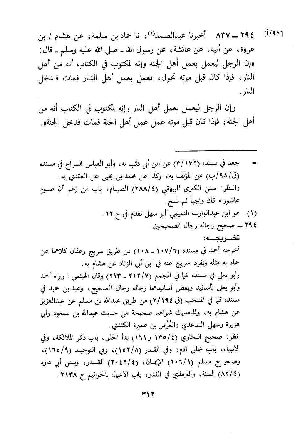837 - أَخْبَرَنَا عَبْدُ الصَّمَدِ، نا حَمَّادُ بْنُ سَلَمَةَ، عَنْ هِشَامِ بْنِ عُرْوَةَ، عَنْ أَبِيهِ، عَنْ عَائِشَةَ، عَنْ رَسُولِ اللَّهِ صَلَّى اللهُ عَلَيْهِ وَسَلَّمَ قَالَ: «إِنَّ §الرَّجُلَ لَيَعْمَلَ بِعَمَلِ أَهْلِ الْجَنَّةِ وَإِنَّهُ لَمَكْتُوبٌ فِي الْكِتَابِ أَنَّهُ مِنْ أَهْلِ النَّارِ فَإِذَا كَانَ قَبْلَ مَوْتِهِ تَحَوَّلَ فَعَمِلَ بِعَمَلِ أَهْلِ النَّارِ فَمَاتَ فَدَخَلَ النَّارَ وَإِنَّ الرَّجُلَ لَيَعْمَلُ بِعَمَلِ أَهْلِ النَّارِ وَإِنَّهُ لَمَكْتُوبٌ فِي الْكِتَابِ أَنَّهُ مِنْ أَهْلِ الْجَنَّةِ فَإِذَا كَانَ قَبْلَ مَوْتِهِ عَمِلَ عَمَلَ أَهْلِ الْجَنَّةِ فَمَاتَ فَدَخَلَ الْجَنَّةَ»