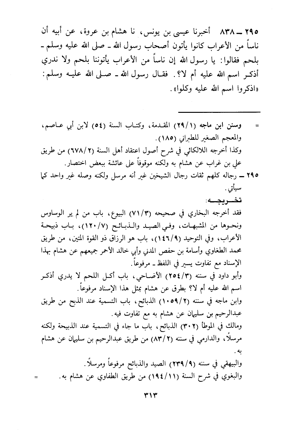 838 - أَخْبَرَنَا عِيسَى بْنُ يُونُسَ، نا هِشَامُ بْنُ عُرْوَةَ، عَنْ أَبِيهِ، أَنَّ نَاسًا مِنَ الْأَعْرَابِ كَانُوا يَأْتُونَ أَصْحَابَ رَسُولِ اللَّهِ صَلَّى اللهُ عَلَيْهِ وَسَلَّمَ بِلَحْمٍ فَقَالُوا يَا رَسُولَ اللَّهِ إِنَّ نَاسًا مِنَ الْأَعْرَابِ يَأْتُونَنَا بِلَحْمٍ وَلَا نَدْرِي أَذُكِرَ اسْمُ اللَّهِ عَلَيْهِ أَمْ لَا فَقَالَ رَسُولُ اللَّهِ صَلَّى اللهُ عَلَيْهِ وَسَلَّمَ: «§اذْكُرُوا اسْمَ اللَّهِ عَلَيْهِ وَكُلُوا»