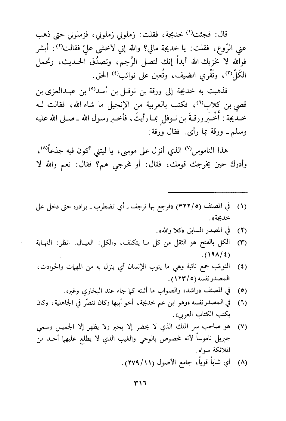 فَقَالَتْ : أَبْشِرْ ، فَوَاللَّهِ لاَ يُخْزِيكَ اللَّهُ أَبَدًا ، إِنَّكَ لَتَصِلُ الرَّحِمَ ، وَتَصْدُقَ الْحَدِيثَ ، وَتَحْمِلُ الْكَلَّ ، وَتَقْرِي الضَّيْفَ ، وَتُعِينُ عَلَى نَوَائِبِ الْحَقِّ ، فَذَهَبَتْ بِهِ خَدِيجَةُ إِلَى وَرَقَةَ بْنِ نَوْفَلِ بْنِ أَسَدِ بْنِ عَبْدِ الْعُزَّى بْنِ قُصَيِّ بْنِ كِلاَبٍ فَكَتَبَ بِالْعَرَبِيَّةِ مِنَ الإِنْجِيلِ مَا شَاءَ اللَّهُ ، فَقَالَتْ لَهُ خَدِيجَةُ : أَخْبِرْ وَرَقَةَ بْنَ نَوْفَلٍ بِمَا رَأَيْتَ ، فَأَخْبَرَ رَسُولُ اللَّهِ صَلَّى اللَّهُ عَلَيْهِ وَسَلَّمَ وَرَقَةَ بِمَا رَأَى ، فَقَالَ وَرَقَةُ : هَذَا النَّامُوسُ الَّذِي أُنْزِلَ عَلَى مُوسَى ، يَا لَيْتَنِي أَكُونُ فِيهِ جَذَعًا ، وَأَدْرِكُ حِينَ يُخْرِجُكَ قَوْمُكَ ، فَقَالَ : أَوَ مُخْرِجِيَّ هُمْ ؟ فَقَالَ : نَعَمْ ، وَاللَّهِ لاَ يَأْتِي أَحَدٌ بِمِثْلِ مَا جِئْتَ بِهِ إِلاَّ عُودِي ، وَلَئِنْ أَدْرَكْتُ يَوْمَكَ لأَنْصُرَنَّكَ نَصْرًا مُؤَزَّرًا ، وَفَتَرَ الْوَحْيُ عَنْ رَسُولِ اللَّهِ صَلَّى اللَّهُ عَلَيْهِ وَسَلَّمَ فَتْرَةً ؛ فَحَزِنَ رَسُولُ اللَّهِ صَلَّى اللَّهُ عَلَيْهِ وَسَلَّمَ ، فِيمَا بَلَغَنَا ، حُزْنًا غَدَا مِنْهُ مِرَارًا ، حَتَّى يَكُونَ عَلَى شَوَاهِقِ رُؤُوسِ الْجبَالِ ، فَلَمَّا كَانَ كَذَلِكَ تَبَدَّى لَهُ جِبْرِيلُ ، فَيَقُولُ لَهُ : يَا مُحَمَّدُ ، إِنَّكَ رَسُولُ اللَّهِ حَقًّا ، فَيَسْكُنُ بِذَلِكَ جَأْشُهُ وَتَقَرُّ نَفْسُهُ ، فَكُلَّمَا فَتَرَ الْوَحْيُ فَتْرَةً فَعَلَ مِثْلَ ذَلِكَ ، وَتَبَدَّى لَهُ جِبْرِيلُ فَقَالَ لَهُ مِثْلَ ذَلِكَ.
