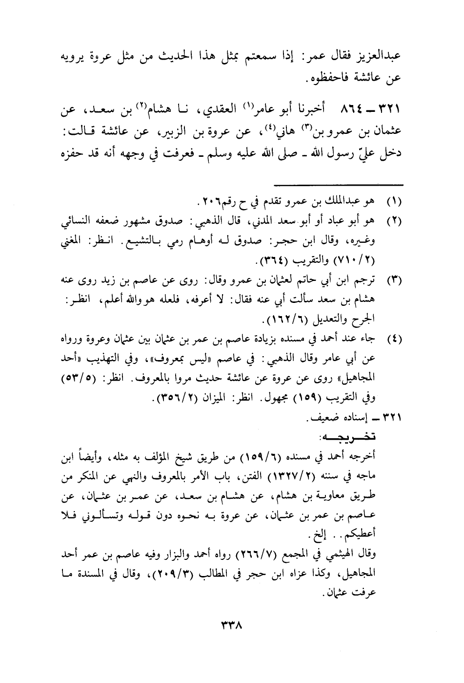 864 - أَخْبَرَنَا أَبُو عَامِرٍ الْعَقَدِيُّ، نا هِشَامُ بْنُ سَعْدٍ، عَنْ عُثْمَانَ بْنِ عَمْرِو بْنِ هَانِئٍ، عَنْ عُرْوَةَ بْنِ الزُّبَيْرِ، عَنْ عَائِشَةَ، قَالَتْ دَخَلَ عَلَيَّ رَسُولُ اللَّهِ صَلَّى اللهُ عَلَيْهِ وَسَلَّمَ فَعَرَفْتُ فِي وَجْهِهِ أَنَّهُ قَدْ حَفَزَهُ شَيْءٌ فَتَوَضَّأَ ثُمَّ خَرَجَ وَلَمْ يَتَكَلَّمَ فَاقْتَرَبْتُ مِنَ الْجُدْرَانِ فَسَمِعْتُهُ يَقُولُ: «يَا أَيُّهَا النَّاسُ إِنَّ اللَّهَ يَقُولُ §مُرُوا بِالْمَعْرُوفِ وَانْهَوْا عَنِ الْمُنْكَرِ قَبْلَ أَنْ تَدْعُونِي فَلَا أُجِيبُكُمْ وَتَسْأَلُونَ فَلَا أُعْطِيكُمْ وَتَسْتَنْصِرُونِي فَلَا أَنْصُرُكُمْ»