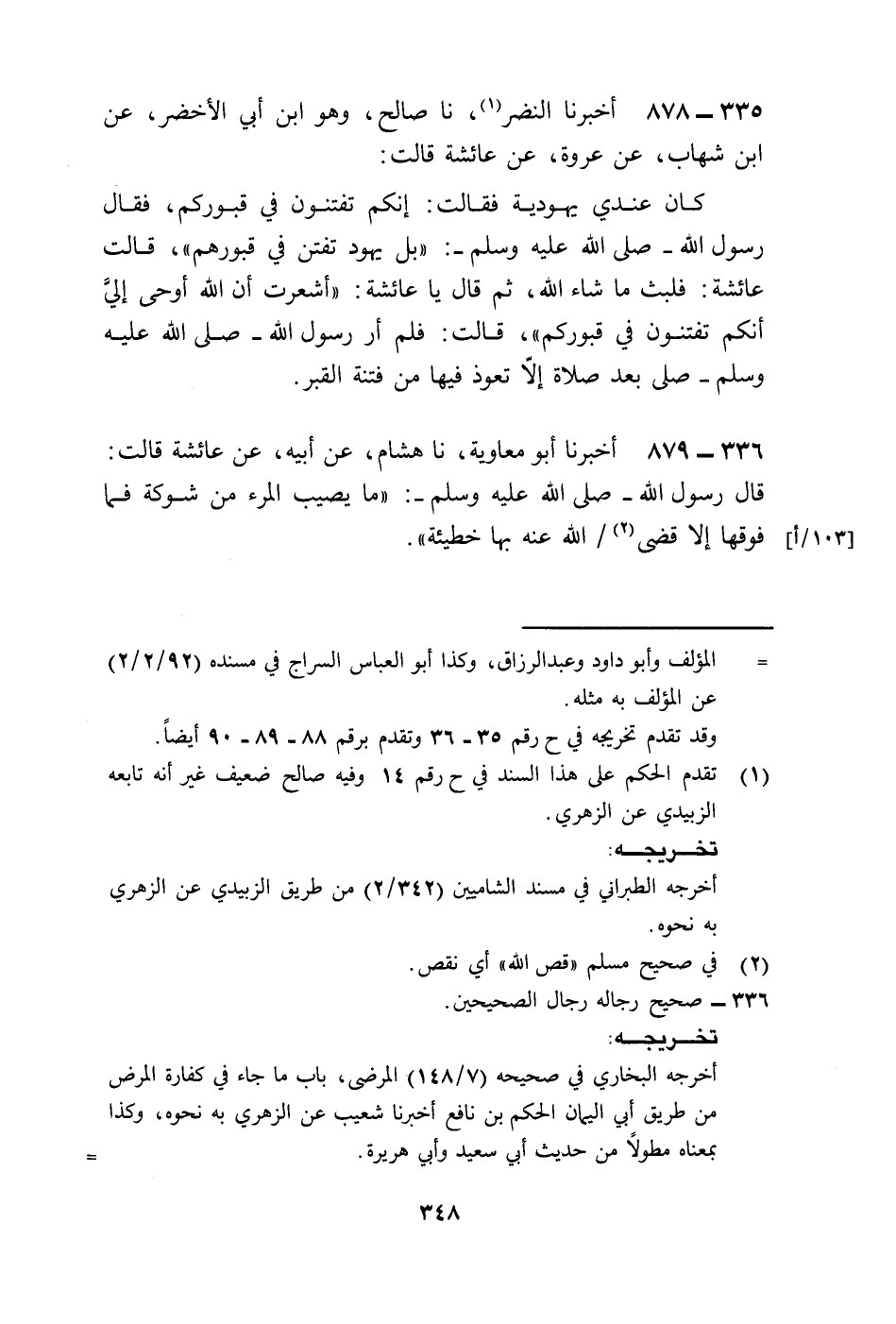 879 - أَخْبَرَنَا أَبُو مُعَاوِيَةَ، نا هِشَامٌ، عَنْ أَبِيهِ، عَنْ عَائِشَةَ، قَالَتْ قَالَ رَسُولُ اللَّهِ صَلَّى اللهُ عَلَيْهِ وَسَلَّمَ «§مَا يُصِيبُ الْمَرْءَ مِنْ شَوْكَةٍ فَمَا فَوْقَهَا إِلَّا قَضَى اللَّهُ عَنْهُ بِهَا خَطِيئَةً»